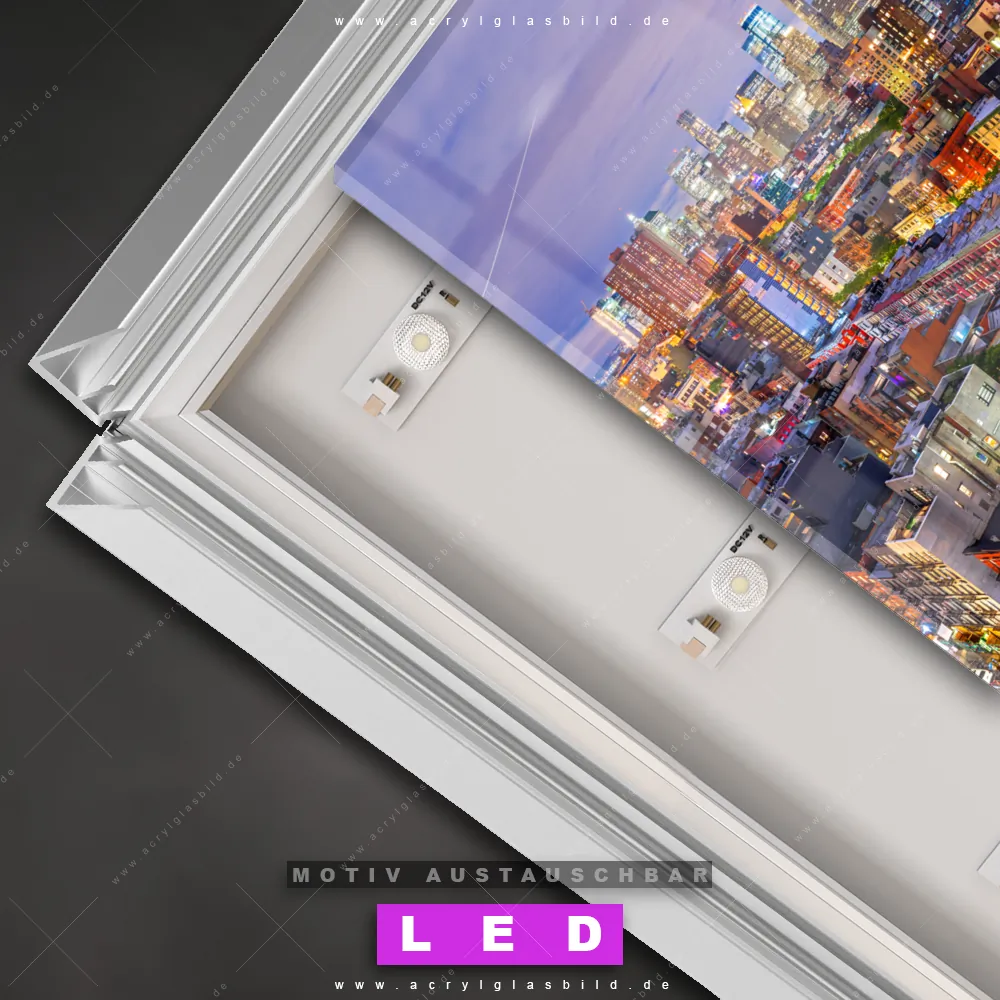 Also, worauf wartest du noch? Gib mit einem beleuchteten Wandbild mit wechselbarer Acrylglas-Scheibe deinen Wänden das gewisse Etwas und bestelle jetzt das LED Acrylglasbild Canvalight® DIA Urbaner Abendhimmel von New York – dein Zuhause wird es dir danken und deine Freunde werden dank der wechselbaren Motive erblassen!