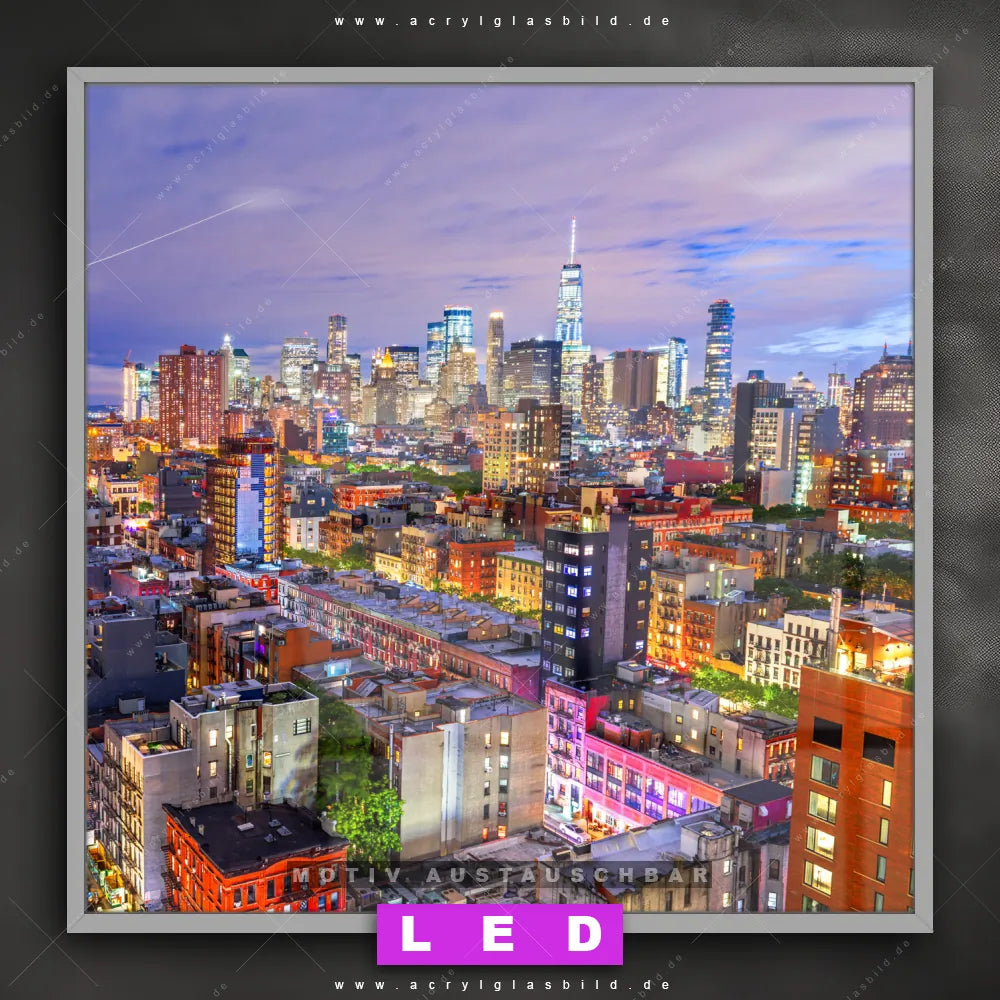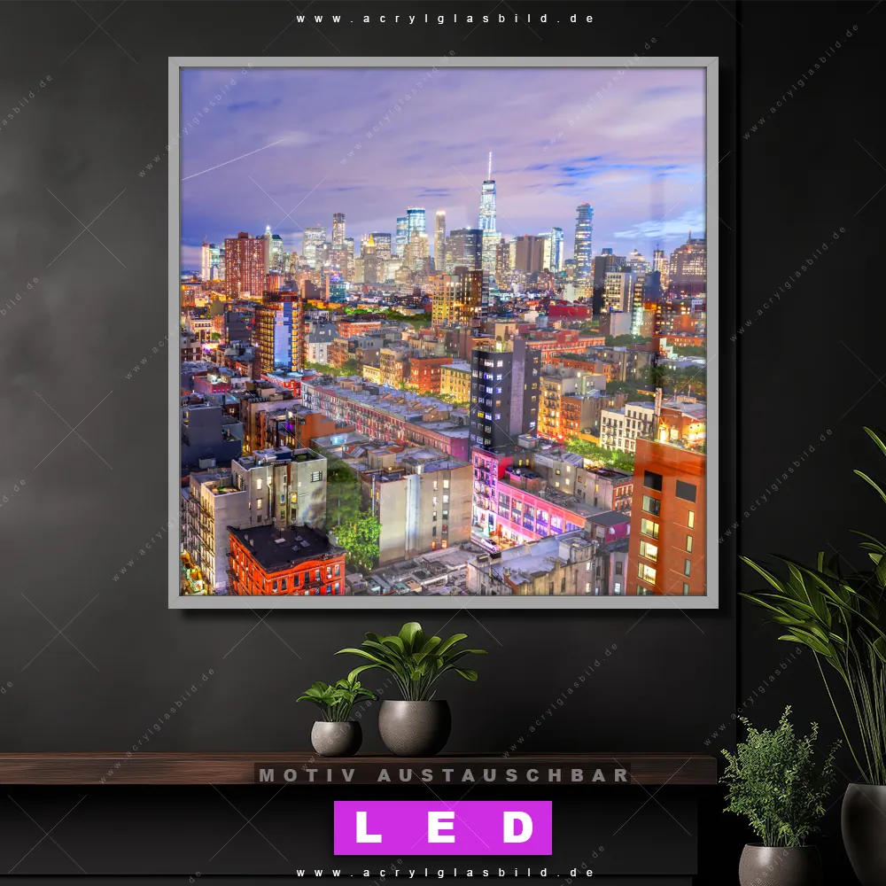 Bist du bereit, deine Wände mit einem dimmbaren LED Bild mit Fernbedienung und optionaler Farbtemperatursteuerung zum Leuchten zu bringen? Wir haben das ultimative Architektur - Gebäude, Städte - Skylines LED Acrylglasbild Canvalight® DIA für dich! Unser LED Wandbild aus Acrylglas New York Skyline im Quadratischen Format mit austauschbarer bedruckter Acrylglas-Scheibe im DIA-Klapprahmen bringt sofort jede Menge Glanz in deine vier Wände.