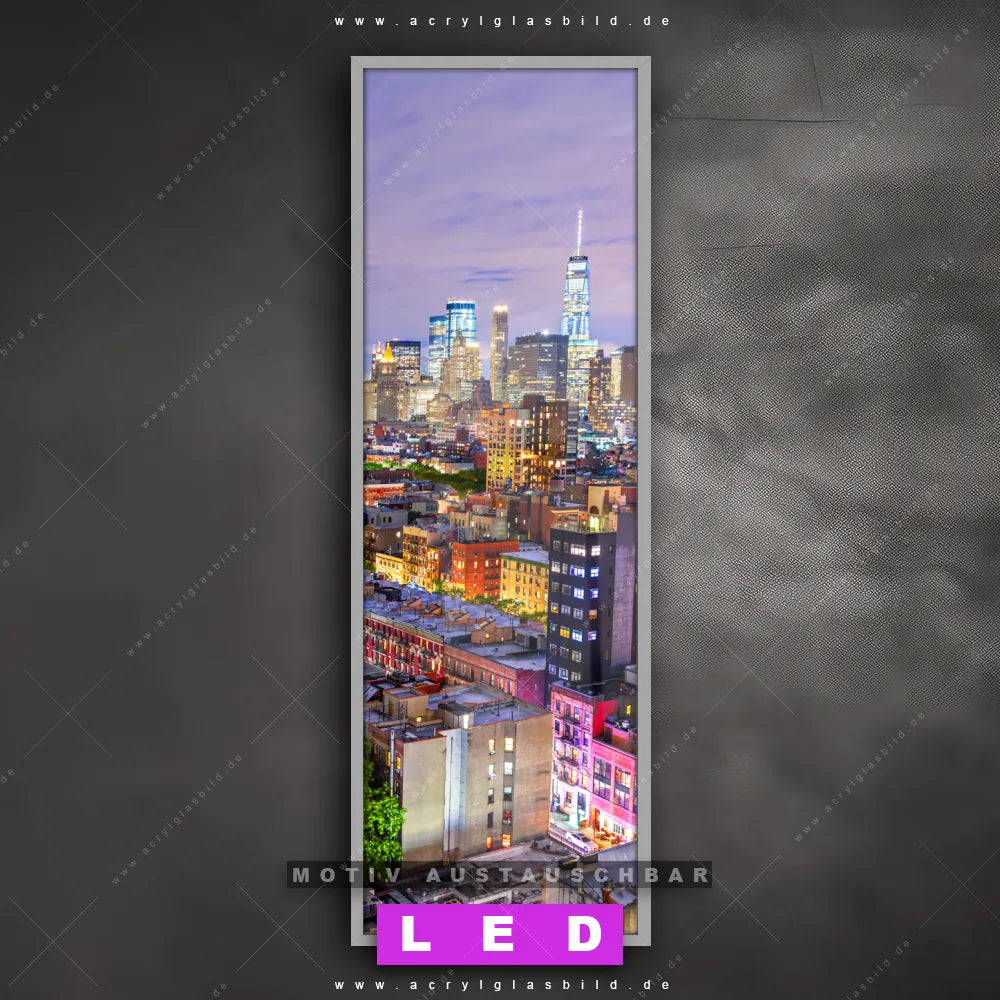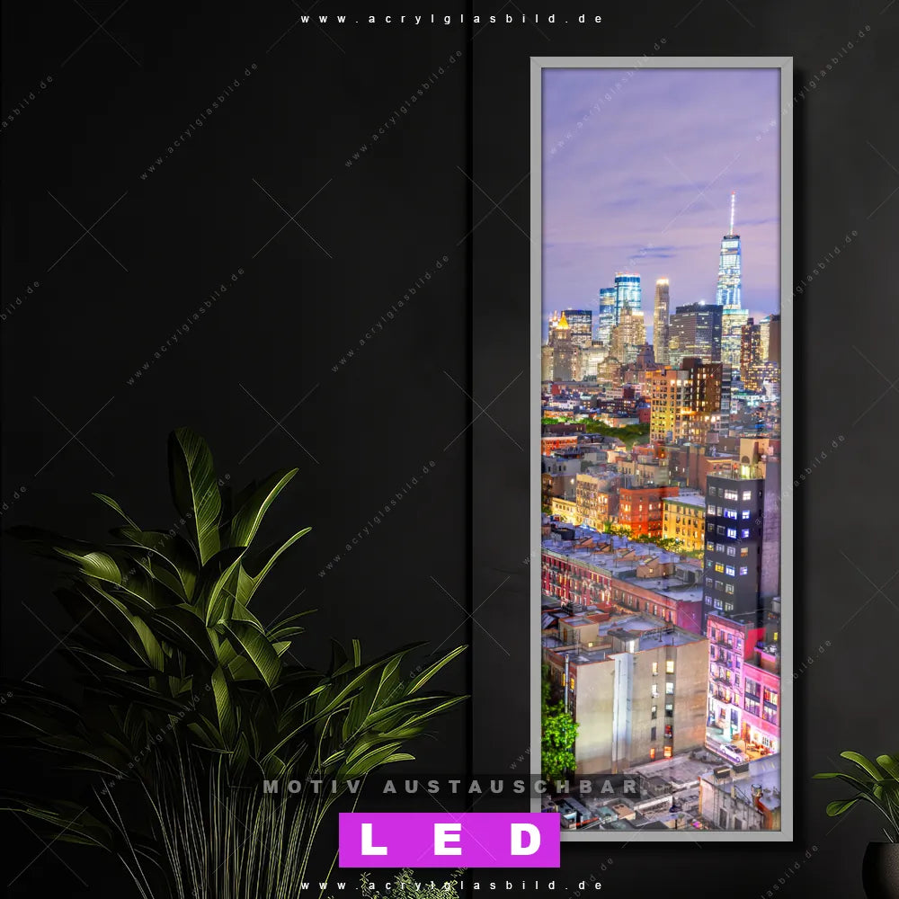 Bist du bereit, deine Wände mit einem dimmbaren LED Bild mit Fernbedienung und optionaler Farbtemperatursteuerung auf das nächste Level zu bringen? Unser Architektur - Gebäude, Städte - Skylines Canvalight® DIA LED Acrylglasbild ist genau das, was du brauchst! Das Wandbild mit LED Beleuchtung im Schmalen Format mit austauschbarer bedruckter Acrylglas-Scheibe New York Skyline bringt Licht und Stil in dein Zuhause – und das in null Komma nichts!