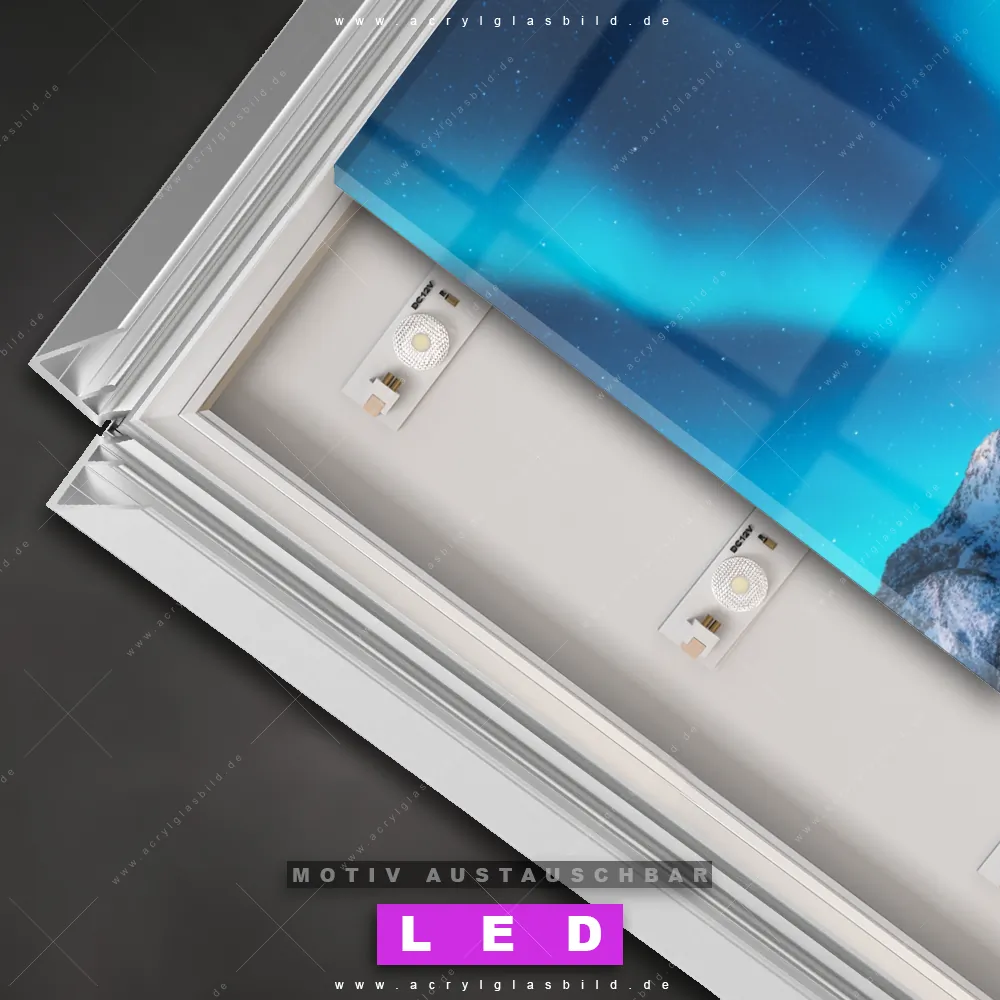 Du suchst nach einem Wandbild mit LED Beleuchtung als ultimativen Hingucker für deine Wände? Dann haben wir das perfekte dimmbare LED Bild mit Fernbedienung und optionaler Farbtemperatursteuerung für dich: unser abgefahrenes Landschaften Canvalight® DIA LED Acrylglasbild! Mit dem LED Leuchtbild aus Acrylglas Nordlichter und schneebedeckte Berge im Hochformat mit austauschbarer bedruckter Acrylglas-Scheibe bringst du nicht nur Licht, sondern auch ordentlich Stil in deine Bude.