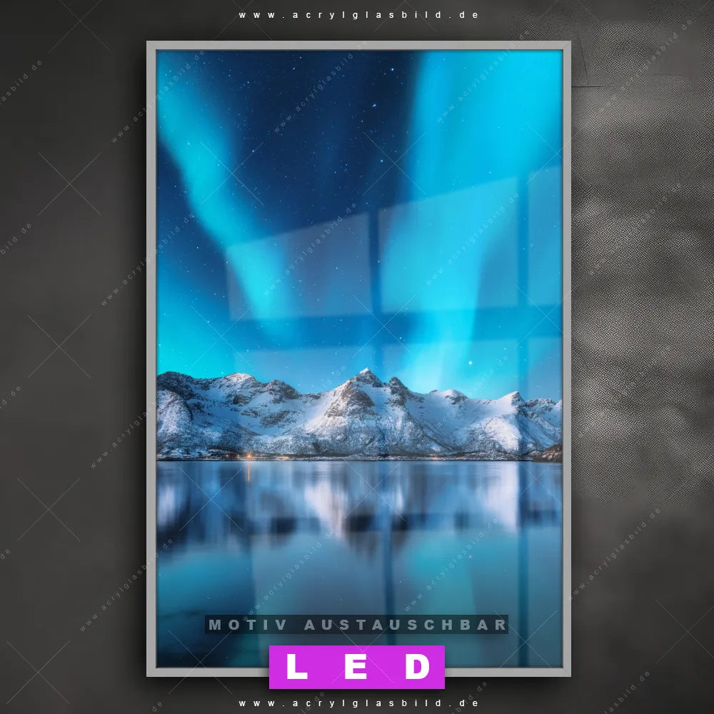 LED Acrylglasbild Canvalight® DIA | Nordlichter und schneebedeckte Berge | Hochformat