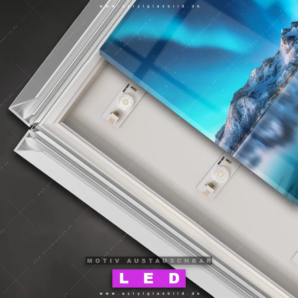 Also, worauf wartest du noch? Gib mit einem beleuchteten Wandbild mit wechselbarer Acrylglas-Scheibe deinen Wänden das gewisse Etwas und bestelle jetzt das LED Acrylglasbild Canvalight® DIA Nordlichter über See an den Bergen – dein Zuhause wird es dir danken und deine Freunde werden dank der wechselbaren Motive erblassen!