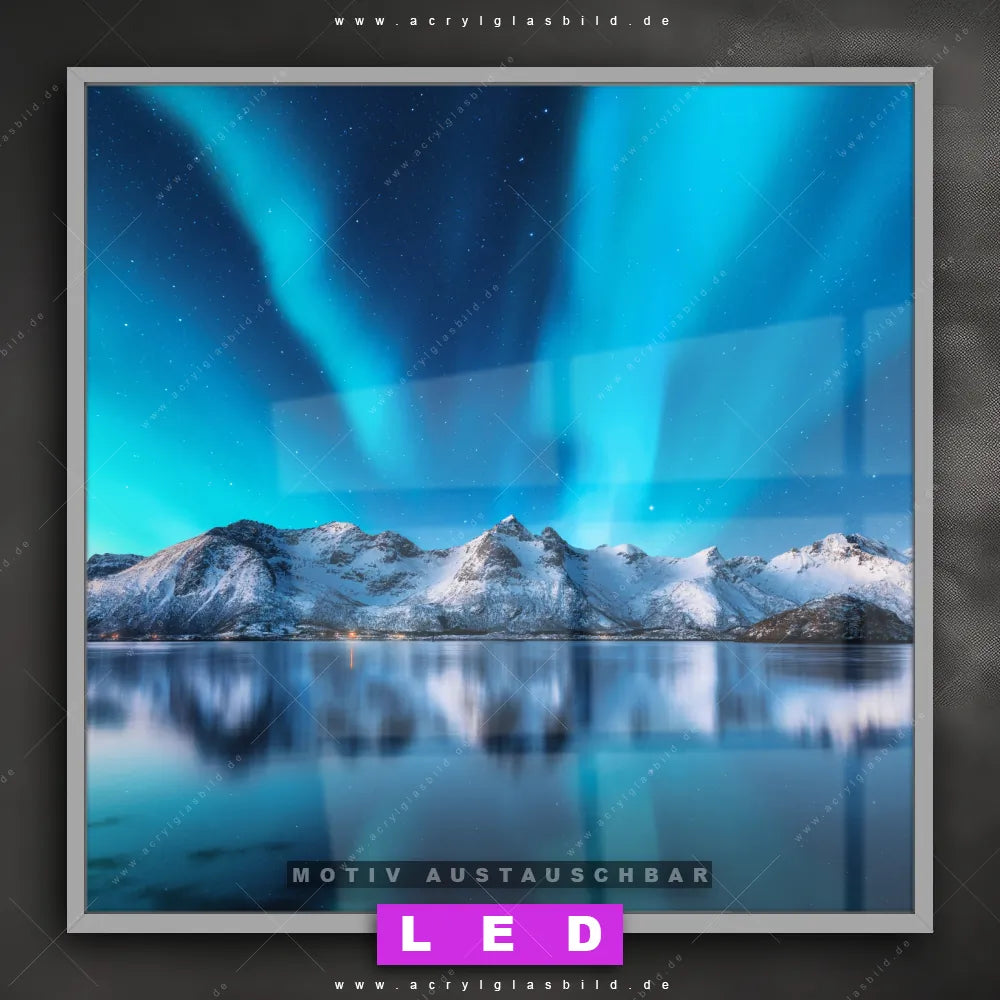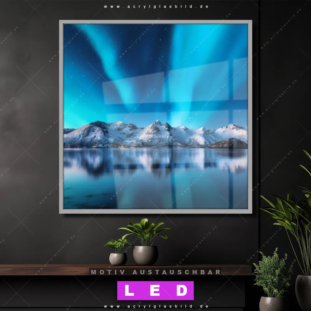 Bist du bereit, deine Wände mit einem dimmbaren LED Bild mit Fernbedienung und optionaler Farbtemperatursteuerung zum Leuchten zu bringen? Wir haben das ultimative Landschaften LED Acrylglasbild Canvalight® DIA für dich! Unser LED Wandbild aus Acrylglas Nordlichter und schneebedeckte Berge im Quadratischen Format mit austauschbarer bedruckter Acrylglas-Scheibe im DIA-Klapprahmen bringt sofort jede Menge Glanz in deine vier Wände.