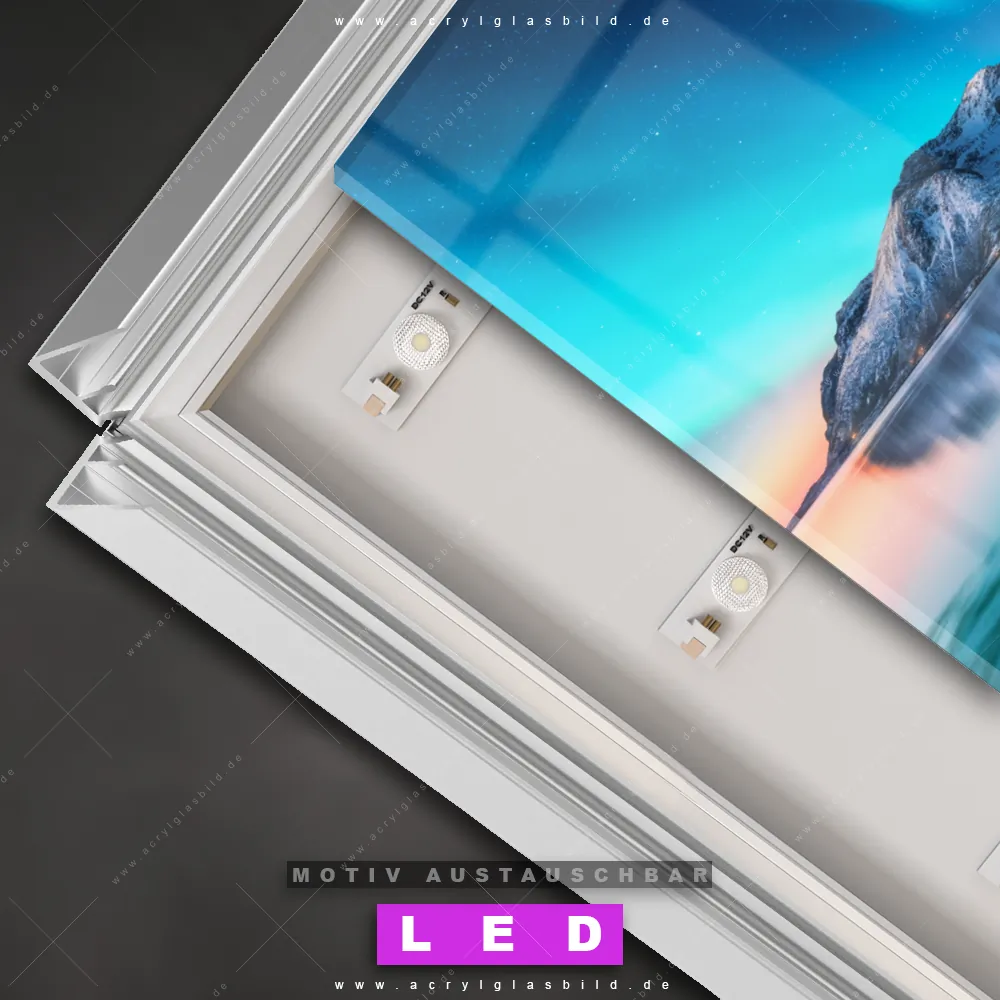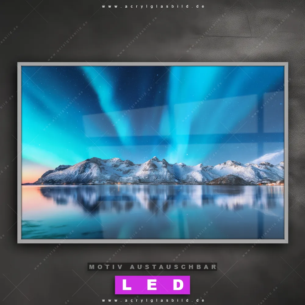 Du bist auf der Suche nach einem dimmbaren Landschaften LED Bild mit Fernbedienung und optionaler Farbtemperatursteuerung? Dann haben wir hier genau das richtige Wandbild mit LED Beleuchtung für dich: Unser Canvalight® DIA LED Acrylglasbild Nordlichter und schneebedeckte Berge im Querformat mit austauschbarer bedruckter Acrylglas-Scheibe. Dieses Leuchtbild bringt sofort Partybeleuchtung in deine Räume!