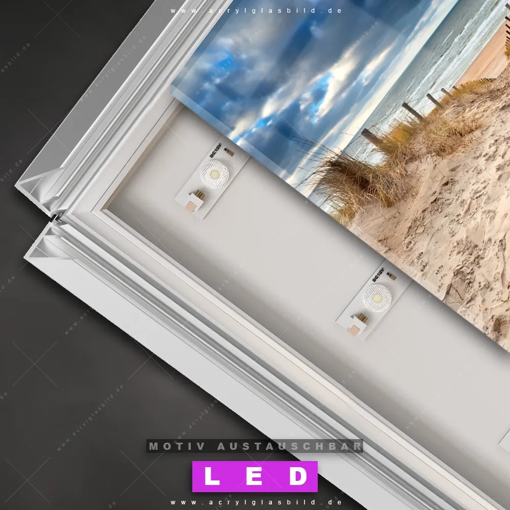 Also, worauf wartest du noch? Gib mit einem beleuchteten Wandbild mit wechselbarer Acrylglas-Scheibe deinen Wänden das gewisse Etwas und bestelle jetzt das LED Acrylglasbild Canvalight® DIA Küste mit Wolken – dein Zuhause wird es dir danken und deine Freunde werden dank der wechselbaren Motive erblassen!
