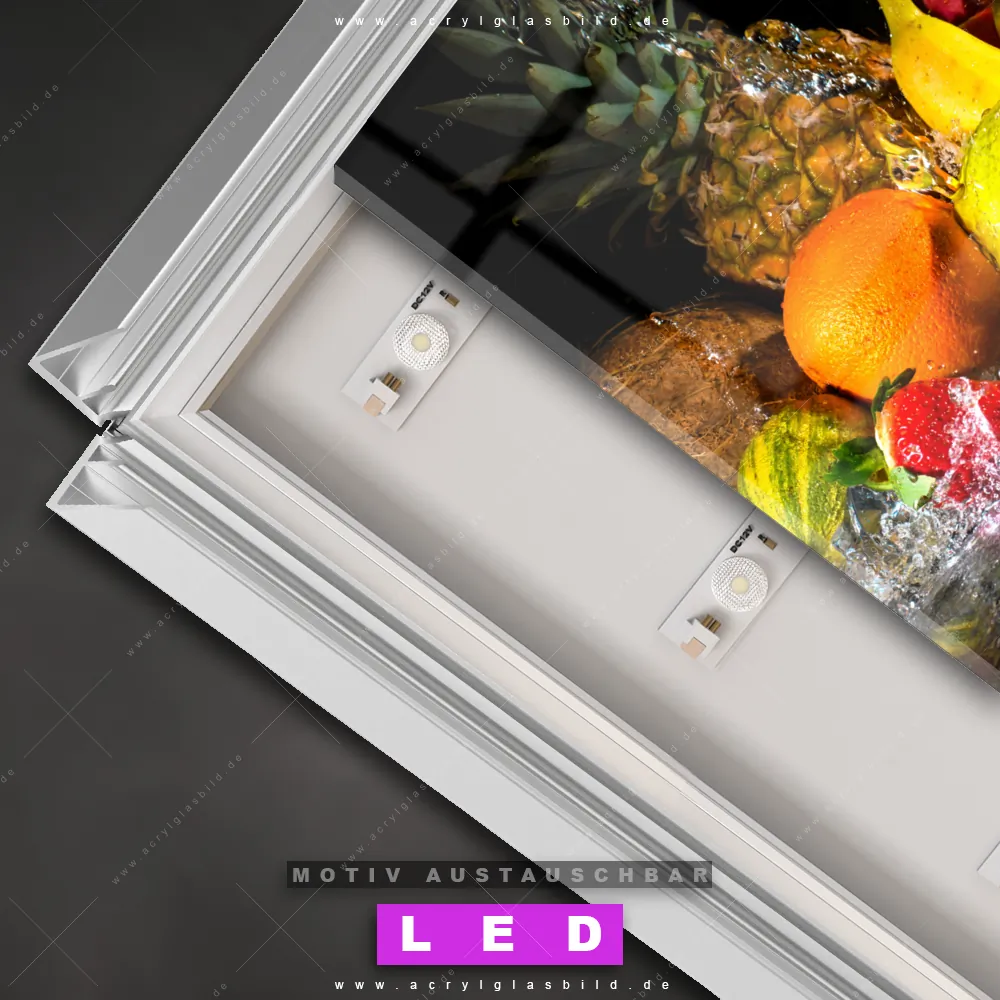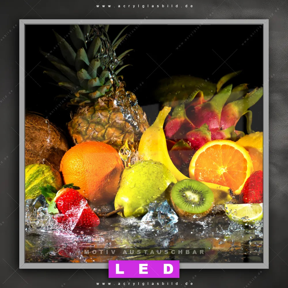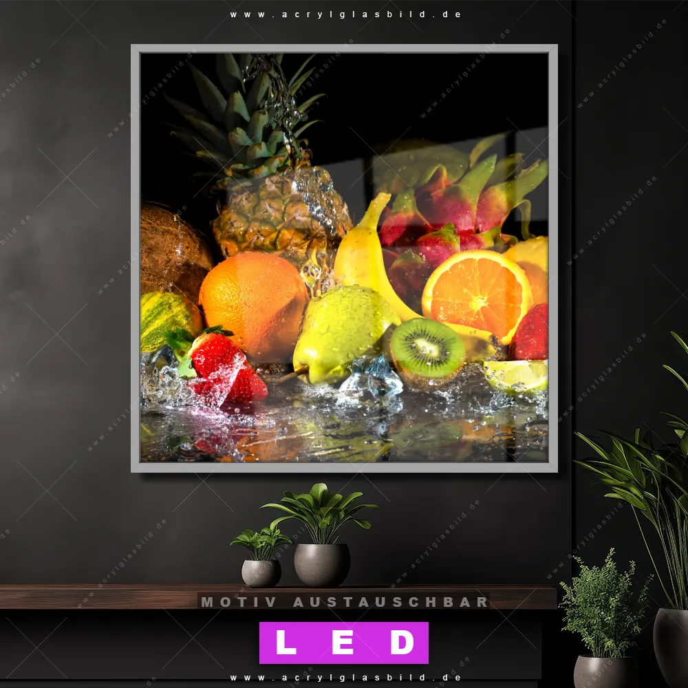 Bist du bereit, deine Wände mit einem dimmbaren LED Bild mit Fernbedienung und optionaler Farbtemperatursteuerung zum Leuchten zu bringen? Wir haben das ultimative Essen - Trinken LED Acrylglasbild Canvalight® DIA für dich! Unser LED Wandbild aus Acrylglas Obst-in spritzendem Wasser im Quadratischen Format mit austauschbarer bedruckter Acrylglas-Scheibe im DIA-Klapprahmen bringt sofort jede Menge Glanz in deine vier Wände.