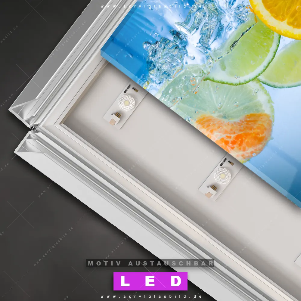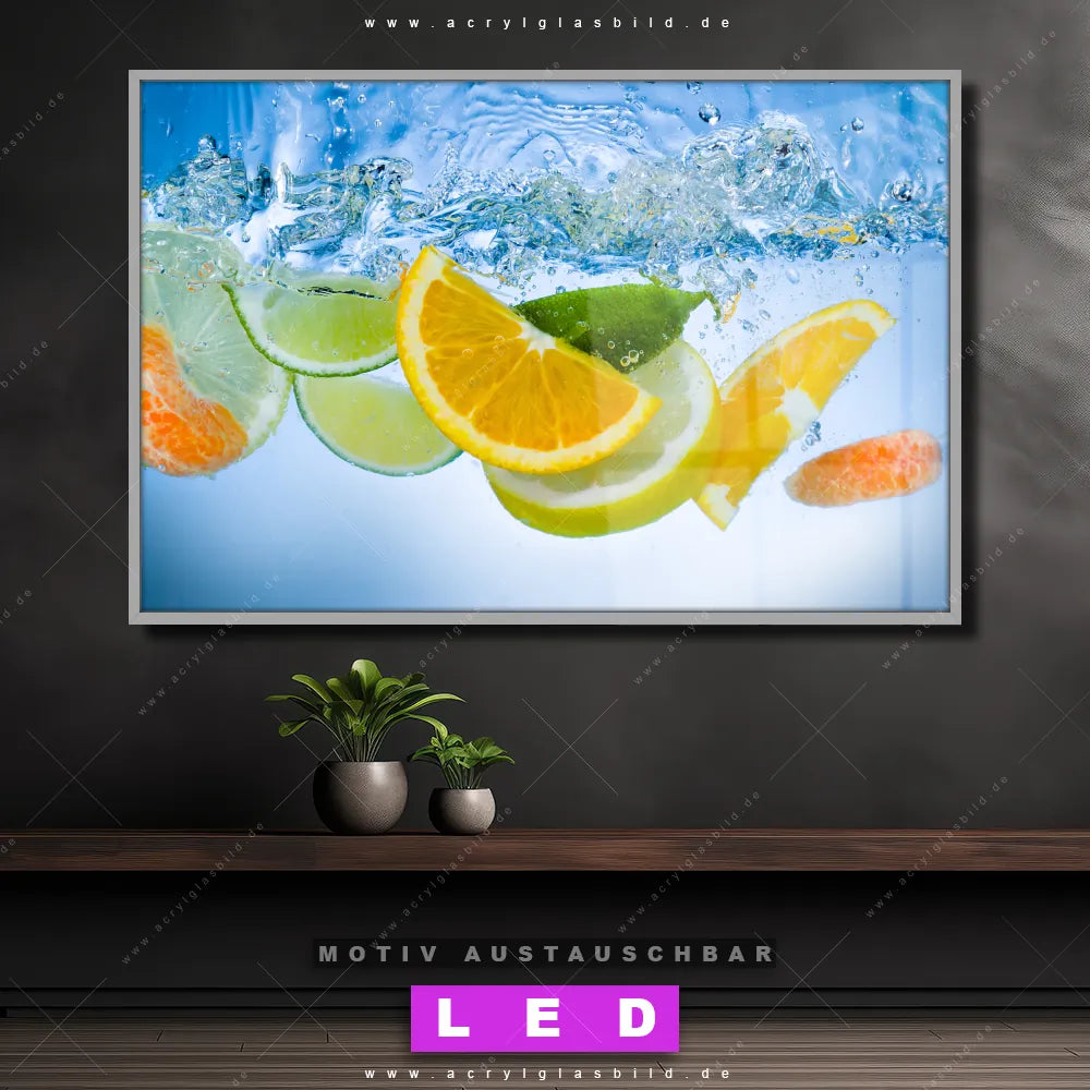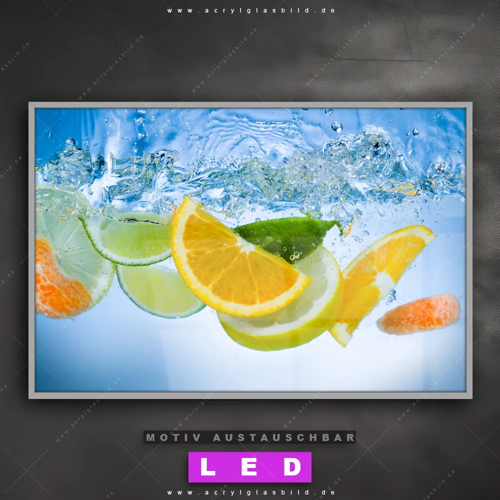 Du bist auf der Suche nach einem dimmbaren Essen - Trinken LED Bild mit Fernbedienung und optionaler Farbtemperatursteuerung? Dann haben wir hier genau das richtige Wandbild mit LED Beleuchtung für dich: Unser Canvalight® DIA LED Acrylglasbild Obst unter Wasser im Querformat mit austauschbarer bedruckter Acrylglas-Scheibe. Dieses Leuchtbild bringt sofort Partybeleuchtung in deine Räume!