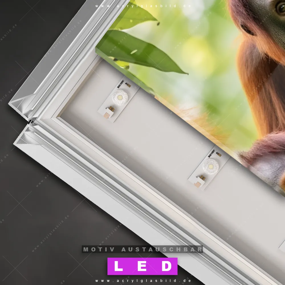 Du suchst nach einem Wandbild mit LED Beleuchtung als ultimativen Hingucker für deine Wände? Dann haben wir das perfekte dimmbare LED Bild mit Fernbedienung und optionaler Farbtemperatursteuerung für dich: unser abgefahrenes Tierwelt Canvalight® DIA LED Acrylglasbild! Mit dem LED Leuchtbild aus Acrylglas Orang Utan Familie im Regenwald im Hochformat mit austauschbarer bedruckter Acrylglas-Scheibe bringst du nicht nur Licht, sondern auch ordentlich Stil in deine Bude.