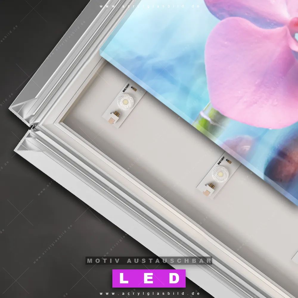 Also, worauf wartest du noch? Verwandle deine Wände mit einem LED Leuchtbild in wahre Kunstwerke und bestelle jetzt das Canvalight® DIA LED Acrylglasbild rosafarbene Blüte mit Steinen im Brunnen. Deine Wände werden strahlen, und deine Freunde werden dank der wechselbaren Motive staunen!