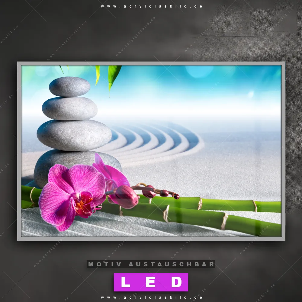 Begriffe wie Buddhismus, Religion, Feng Shui, Zen, Meditation, Blume, Bambus, Zengarten, Steine, Orchidee haben dich auf der Suche nach deinem neuen LED Wandbild aus Acrylglas inspiriert? Dann sollte das LED Acrylglasbild Pinke Orchideen-Blüte den Weg zu dir finden.