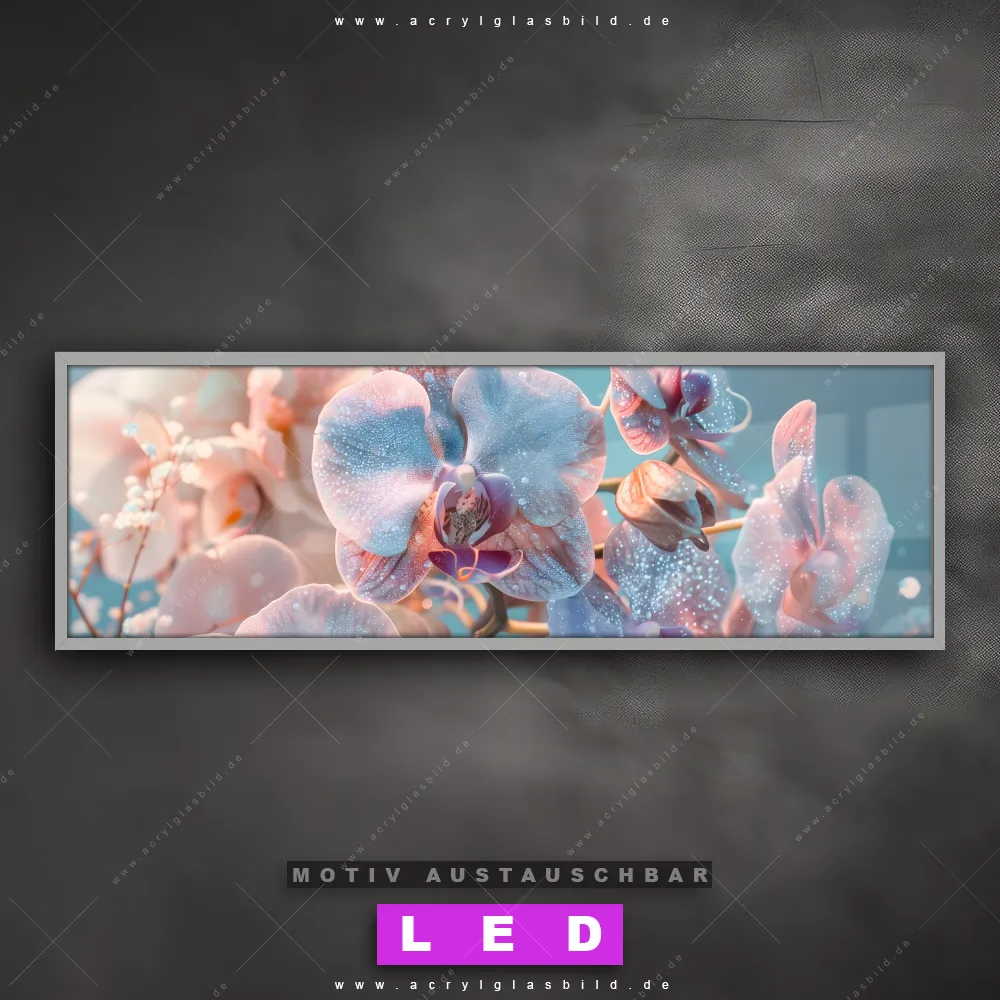 Begriffe wie Blumen, Pflanze, Natur, Blüten, Glitzer, Orchidee haben dich auf der Suche nach deinem neuen LED Wandbild aus Acrylglas inspiriert? Dann sollte das LED Acrylglasbild Magie der Orchideen den Weg zu dir finden.