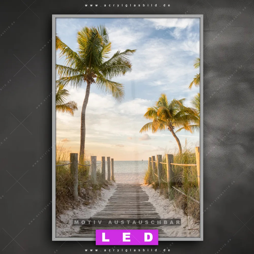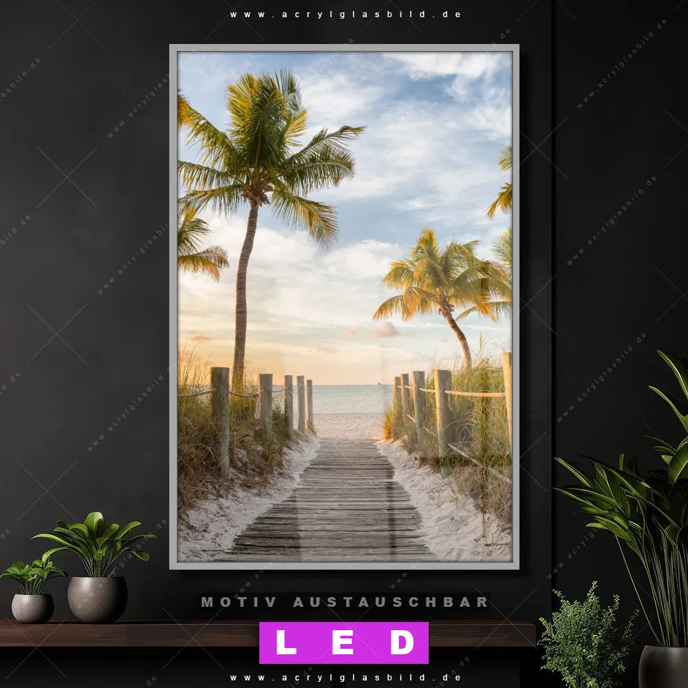Du suchst nach einem Wandbild mit LED Beleuchtung als ultimativen Hingucker für deine Wände? Dann haben wir das perfekte dimmbare LED Bild mit Fernbedienung und optionaler Farbtemperatursteuerung für dich: unser abgefahrenes Landschaften, Strand - Meer Canvalight® DIA LED Acrylglasbild! Mit dem LED Leuchtbild aus Acrylglas Palmen am Strandweg im Hochformat mit austauschbarer bedruckter Acrylglas-Scheibe bringst du nicht nur Licht, sondern auch ordentlich Stil in deine Bude.
