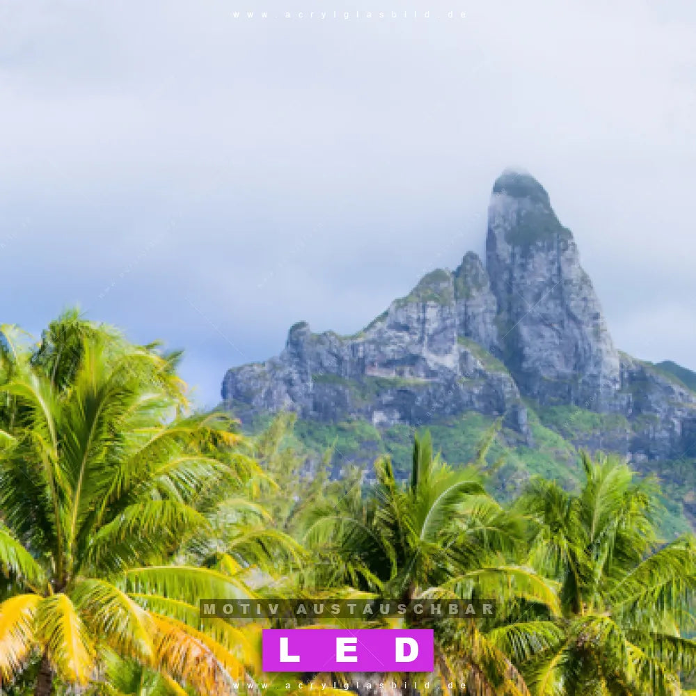 Du suchst nach einem Wandbild mit LED Beleuchtung als ultimativen Hingucker für deine Wände? Dann haben wir das perfekte dimmbare LED Bild mit Fernbedienung und optionaler Farbtemperatursteuerung für dich: unser abgefahrenes Strand - Meer, Landschaften Canvalight® DIA LED Acrylglasbild! Mit dem LED Leuchtbild aus Acrylglas Palmen & Berg auf Insel im Hochformat mit austauschbarer bedruckter Acrylglas-Scheibe bringst du nicht nur Licht, sondern auch ordentlich Stil in deine Bude.