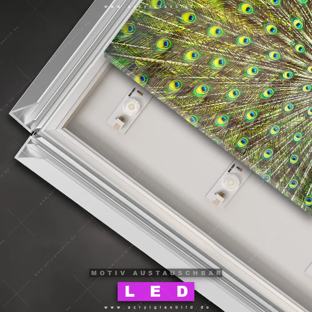 Also, worauf wartest du noch? Gib mit einem beleuchteten Wandbild mit wechselbarer Acrylglas-Scheibe deinen Wänden das gewisse Etwas und bestelle jetzt das LED Acrylglasbild Canvalight® DIA Pfauenrad – dein Zuhause wird es dir danken und deine Freunde werden dank der wechselbaren Motive erblassen!