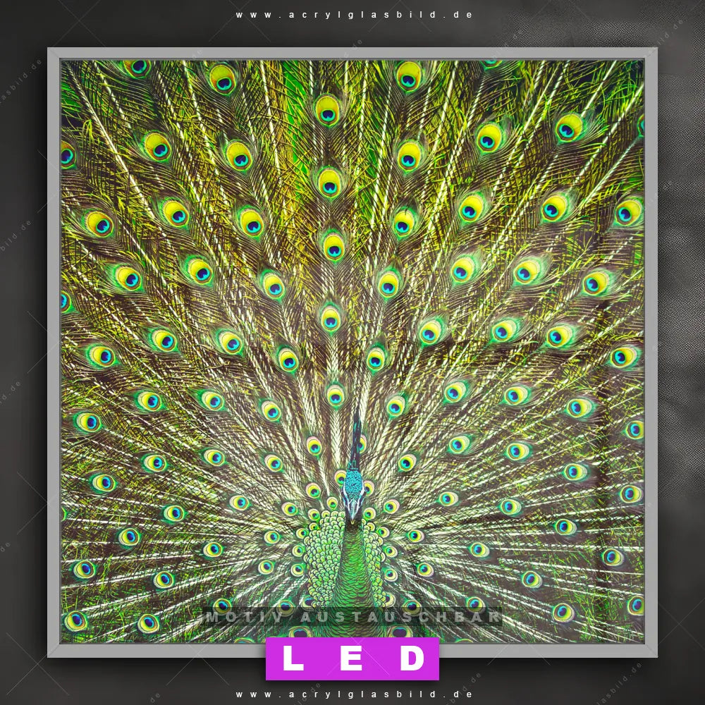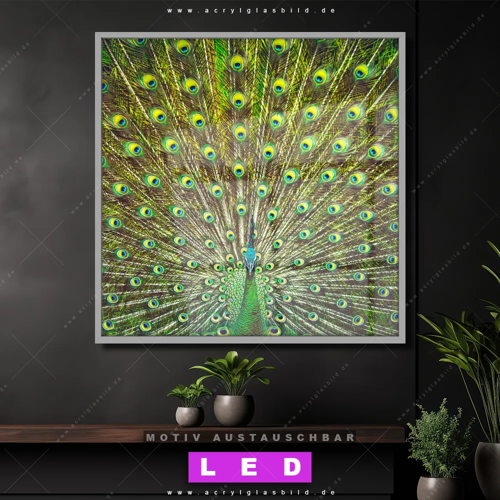 Bist du bereit, deine Wände mit einem dimmbaren LED Bild mit Fernbedienung und optionaler Farbtemperatursteuerung zum Leuchten zu bringen? Wir haben das ultimative Tierwelt LED Acrylglasbild Canvalight® DIA für dich! Unser LED Wandbild aus Acrylglas Pfauenschwanz im Quadratischen Format mit austauschbarer bedruckter Acrylglas-Scheibe im DIA-Klapprahmen bringt sofort jede Menge Glanz in deine vier Wände.