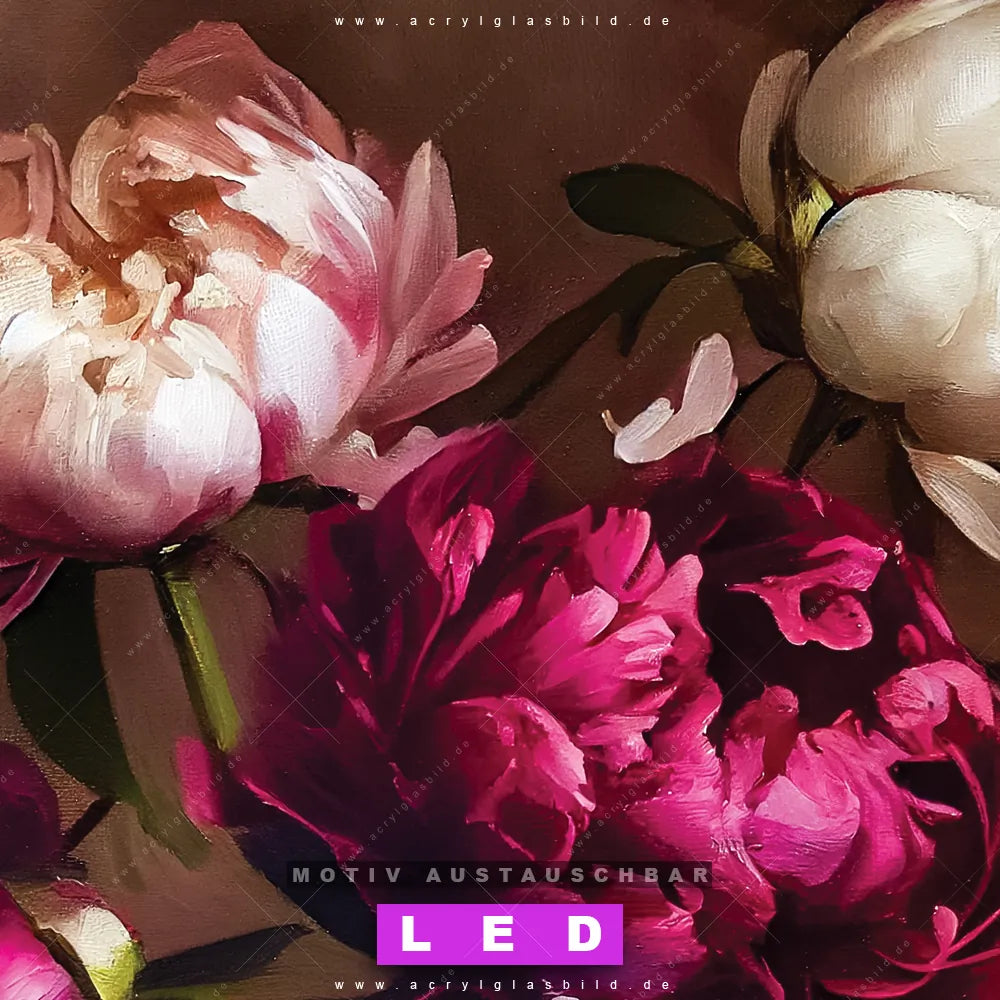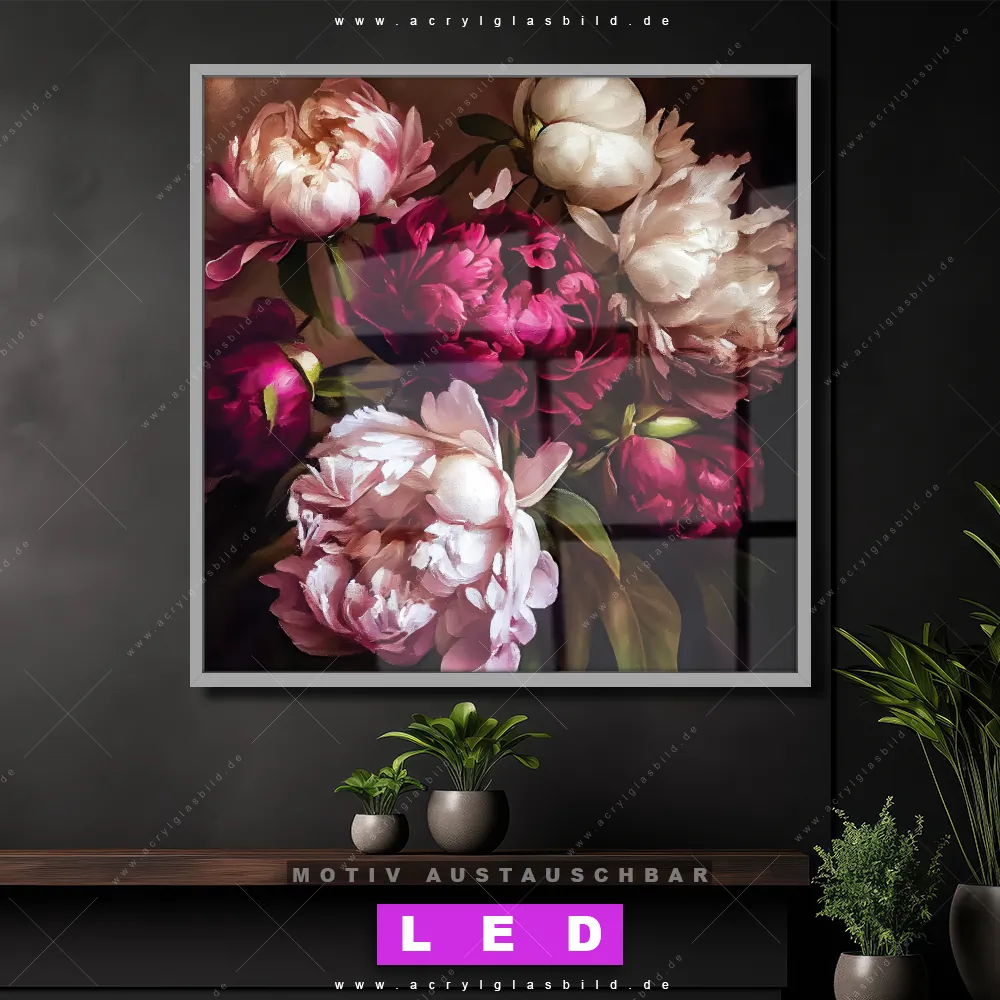 Bist du bereit, deine Wände mit einem dimmbaren LED Bild mit Fernbedienung und optionaler Farbtemperatursteuerung zum Leuchten zu bringen? Wir haben das ultimative Blumen - Botanik LED Acrylglasbild Canvalight® DIA für dich! Unser LED Wandbild aus Acrylglas Pfingstrosen im Barockstil im Quadratischen Format mit austauschbarer bedruckter Acrylglas-Scheibe im DIA-Klapprahmen bringt sofort jede Menge Glanz in deine vier Wände.