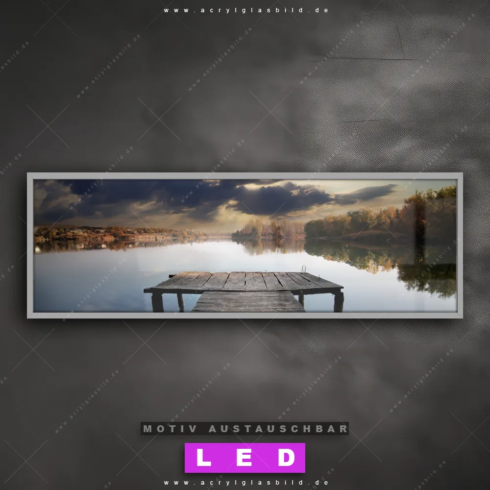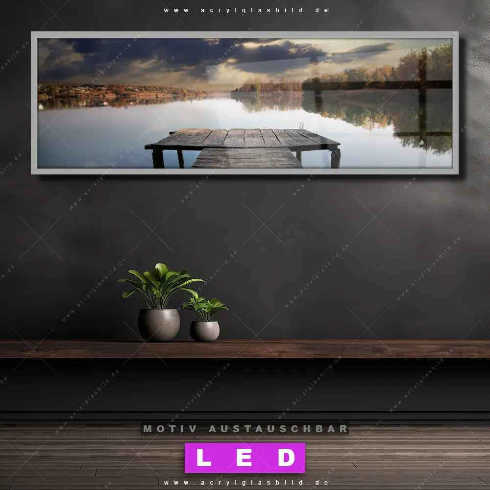 Deine Wände könnten dringend ein dimmbares LED Bild mit Fernbedienung und optionaler Farbtemperatursteuerung gebrauchen? Dann haben wir das perfekte Wandbild mit LED Beleuchtung für dich: unser mega-cooles Landschaften Canvalight® DIA LED Acrylglasbild! Mit unserem angesagten Leuchtbild aus Acrylglas im Panorama-Format und der austauschbaren bedruckten Acrylglas-Scheibe Pier am Fluss bringst du nicht nur Licht, sondern auch jede Menge Flair in deine Räume.