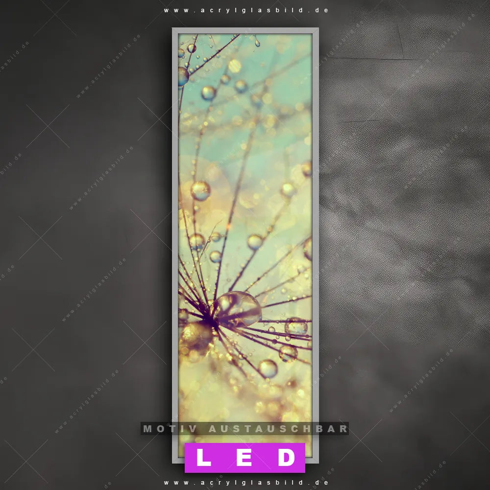 Bist du bereit, deine Wände mit einem dimmbaren LED Bild mit Fernbedienung und optionaler Farbtemperatursteuerung auf das nächste Level zu bringen? Unser Blumen - Botanik Canvalight® DIA LED Acrylglasbild ist genau das, was du brauchst! Das Wandbild mit LED Beleuchtung im Schmalen Format mit austauschbarer bedruckter Acrylglas-Scheibe Pusteblume bei Sonnenuntergang bringt Licht und Stil in dein Zuhause – und das in null Komma nichts!