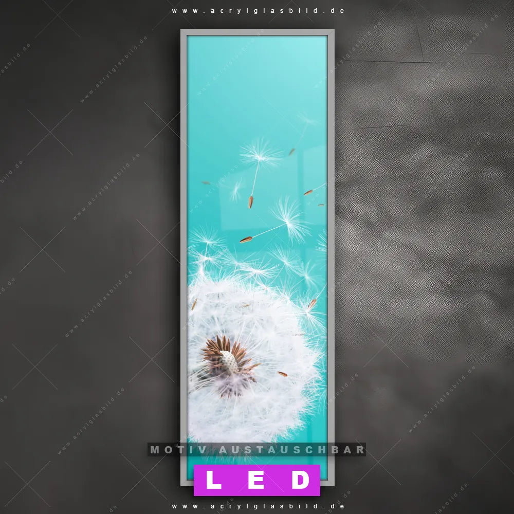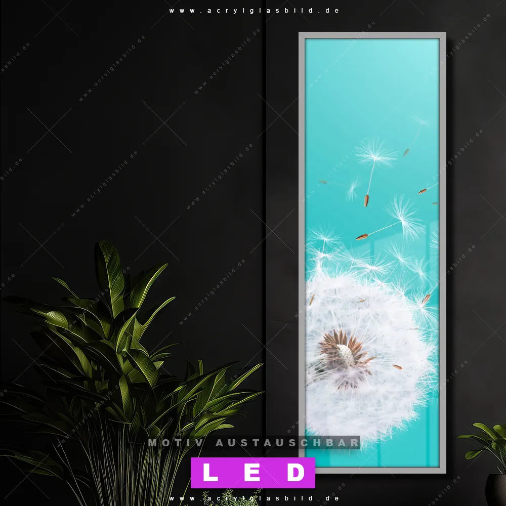 Bist du bereit, deine Wände mit einem dimmbaren LED Bild mit Fernbedienung und optionaler Farbtemperatursteuerung auf das nächste Level zu bringen? Unser Blumen - Botanik Canvalight® DIA LED Acrylglasbild ist genau das, was du brauchst! Das Wandbild mit LED Beleuchtung im Schmalen Format mit austauschbarer bedruckter Acrylglas-Scheibe Pusteblume No. 4 bringt Licht und Stil in dein Zuhause – und das in null Komma nichts!