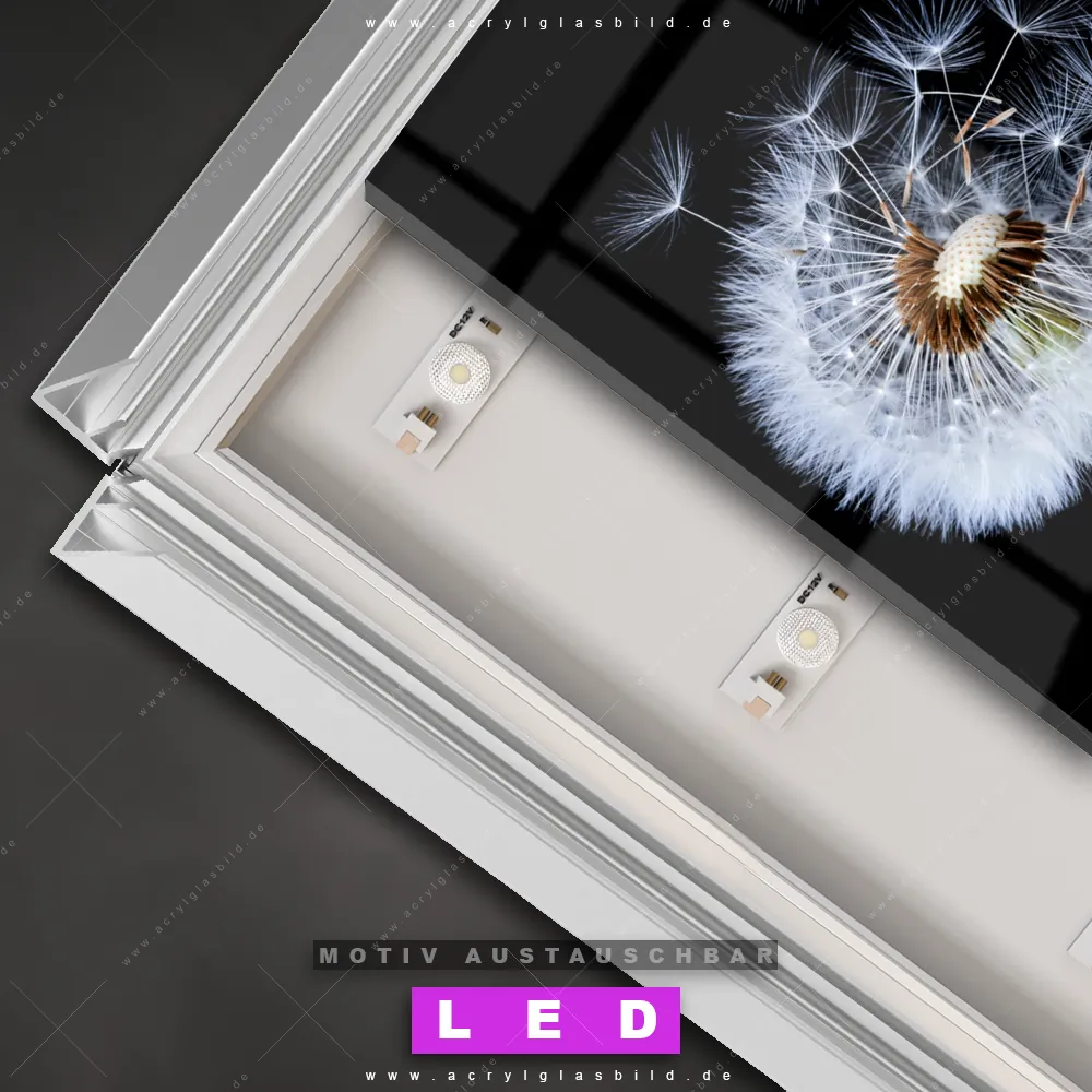 Also, worauf wartest du noch? Gib mit einem beleuchteten Wandbild mit wechselbarer Acrylglas-Scheibe deinen Wänden das gewisse Etwas und bestelle jetzt das LED Acrylglasbild Canvalight® DIA Blüte mit Flugsamen vor schwarzem Hintergrund – dein Zuhause wird es dir danken und deine Freunde werden dank der wechselbaren Motive erblassen!