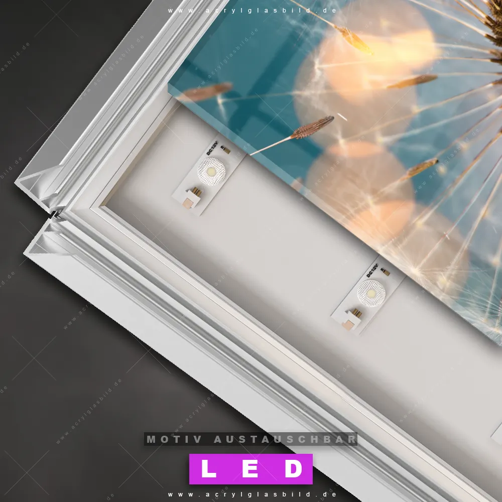 Also, worauf wartest du noch? Gib mit einem beleuchteten Wandbild mit wechselbarer Acrylglas-Scheibe deinen Wänden das gewisse Etwas und bestelle jetzt das LED Acrylglasbild Canvalight® DIA Einzelne Samen einer Pusteblume – dein Zuhause wird es dir danken und deine Freunde werden dank der wechselbaren Motive erblassen!