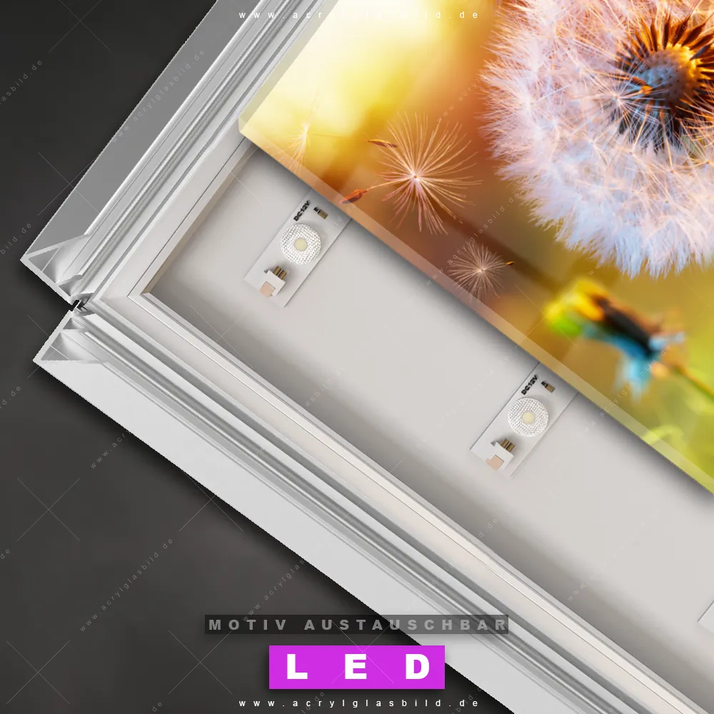 Also, worauf wartest du noch? Gib mit einem beleuchteten Wandbild mit wechselbarer Acrylglas-Scheibe deinen Wänden das gewisse Etwas und bestelle jetzt das LED Acrylglasbild Canvalight® DIA Pusteblumen im Gras – dein Zuhause wird es dir danken und deine Freunde werden dank der wechselbaren Motive erblassen!