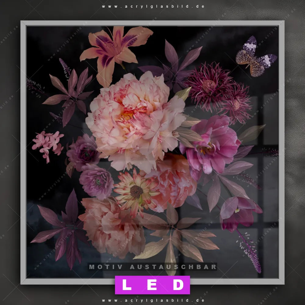 Vergiss dunkle Ecken und Langeweile! Mit unserem Acrylglasbild Blütenzauber mit Pfingstrosen und seiner brillanten LED-Ausleuchtung wirst du dich nie wieder in der Dunkelheit verirren. Wenn du auf der Suche nach einem beleuchteten Wandbild aus Acrylglas mit Pflanze, Blüte, Nahaufnahme, Draufsicht, vintage, Blumen, Pfingstrosen bist, ist unser LED Acrylglasbild Canvalight® DIA Blumen auf schwarzem Untergrund mit den strahlenden Motiv-Farben Schwarz, Pink, Rosa genau das richtige Leuchtbild für dich. Das im Floral, Retro - Vintage Stil gestaltete LED Bild mit glänzender Front aus Acrylglas passt perfekt zu jedem Einrichtungsstil in Arzt - Praxis, Büro - Kanzlei, Wohnzimmer - Schlafzimmer, Flur - Eingangsbereich – vom minimalistischen Chic bis zum kreativen Chaos.