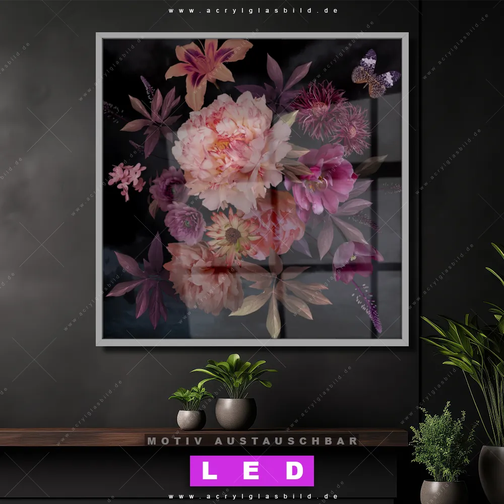 Bist du bereit, deine Wände mit einem dimmbaren LED Bild mit Fernbedienung und optionaler Farbtemperatursteuerung zum Leuchten zu bringen? Wir haben das ultimative Blumen - Botanik LED Acrylglasbild Canvalight® DIA für dich! Unser LED Wandbild aus Acrylglas Romantische Blumenillustration im Quadratischen Format mit austauschbarer bedruckter Acrylglas-Scheibe im DIA-Klapprahmen bringt sofort jede Menge Glanz in deine vier Wände.