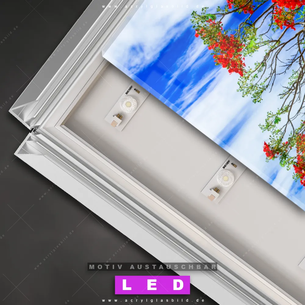 Du suchst nach einem Wandbild mit LED Beleuchtung als ultimativen Hingucker für deine Wände? Dann haben wir das perfekte dimmbare LED Bild mit Fernbedienung und optionaler Farbtemperatursteuerung für dich: unser abgefahrenes Landschaften, Strand - Meer Canvalight® DIA LED Acrylglasbild! Mit dem LED Leuchtbild aus Acrylglas Rote Blüten und Türkisfarbenes Meer im Hochformat mit austauschbarer bedruckter Acrylglas-Scheibe bringst du nicht nur Licht, sondern auch ordentlich Stil in deine Bude.