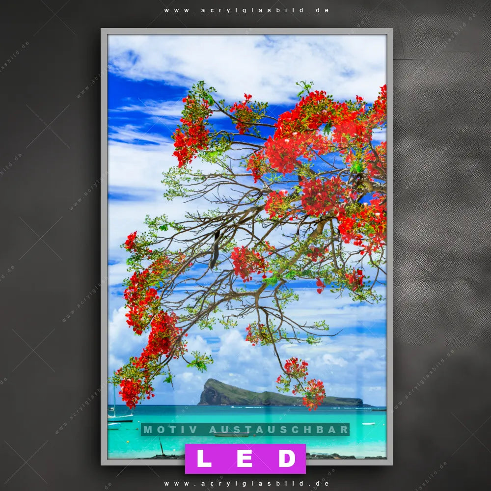 LED Acrylglasbild Canvalight® DIA | Rote Blüten und Türkisfarbenes Meer | Hochformat