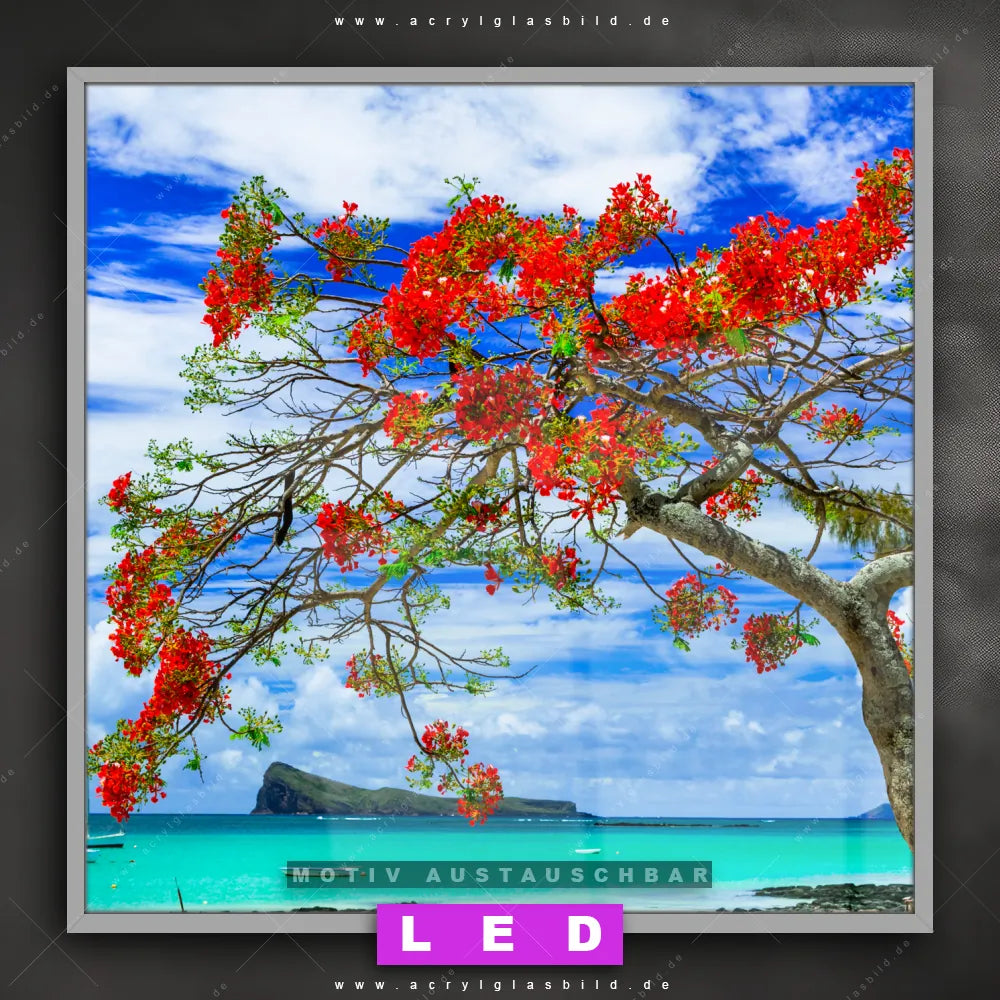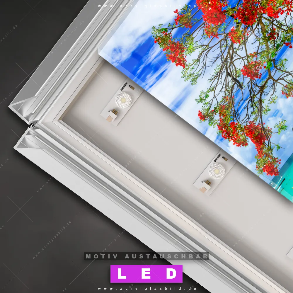 Bist du bereit, deine Wände mit einem dimmbaren LED Bild mit Fernbedienung und optionaler Farbtemperatursteuerung zum Leuchten zu bringen? Wir haben das ultimative Landschaften, Strand - Meer LED Acrylglasbild Canvalight® DIA für dich! Unser LED Wandbild aus Acrylglas Rote Blüten und Türkisfarbenes Meer im Quadratischen Format mit austauschbarer bedruckter Acrylglas-Scheibe im DIA-Klapprahmen bringt sofort jede Menge Glanz in deine vier Wände.