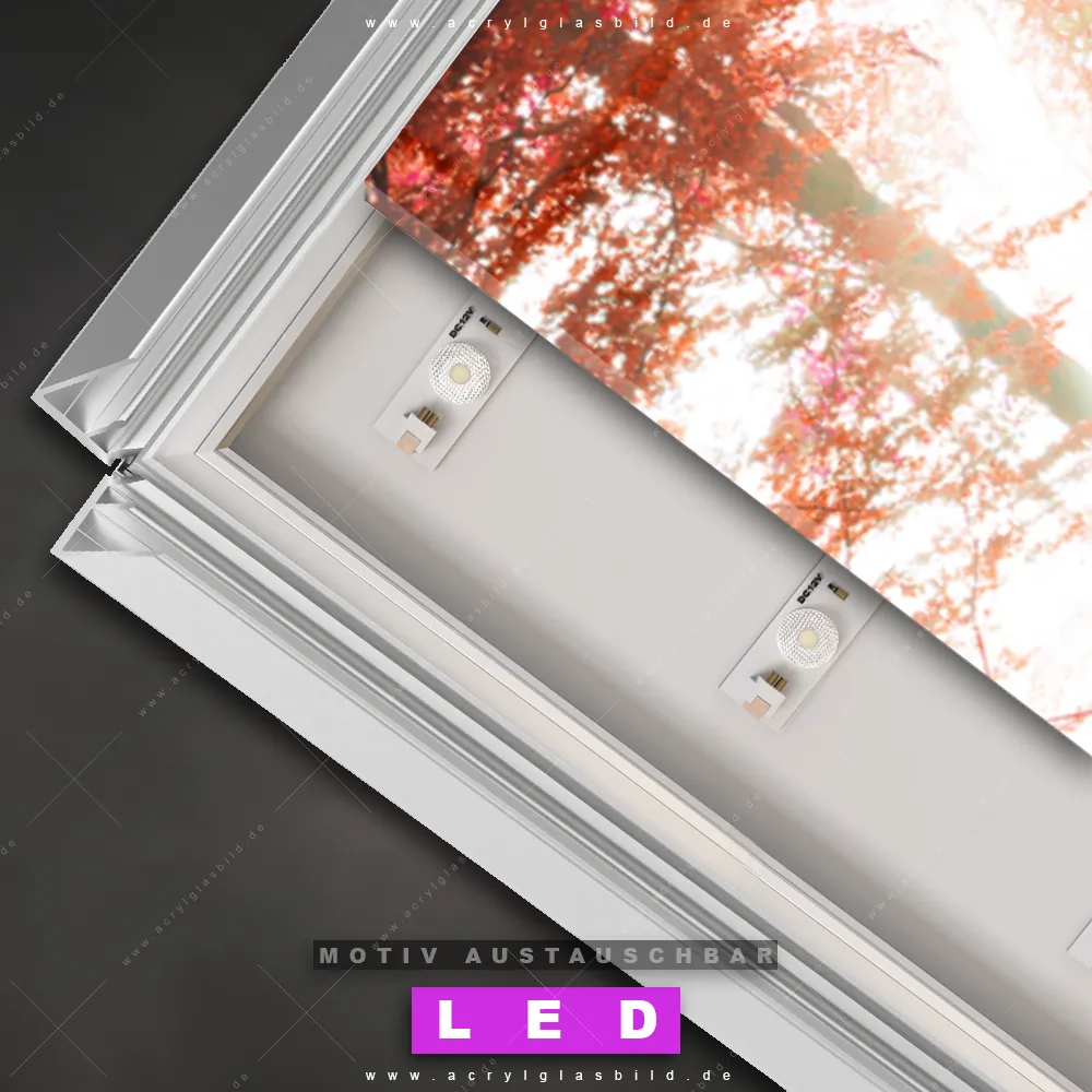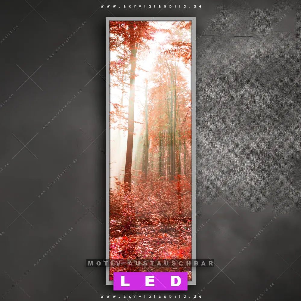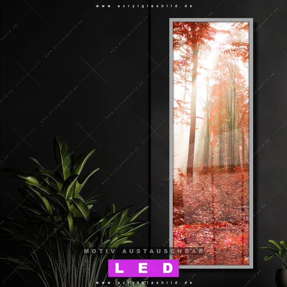 Bist du bereit, deine Wände mit einem dimmbaren LED Bild mit Fernbedienung und optionaler Farbtemperatursteuerung auf das nächste Level zu bringen? Unser Landschaften, Wald - Bäume Canvalight® DIA LED Acrylglasbild ist genau das, was du brauchst! Das Wandbild mit LED Beleuchtung im Schmalen Format mit austauschbarer bedruckter Acrylglas-Scheibe Roter Herbstwald bringt Licht und Stil in dein Zuhause – und das in null Komma nichts!