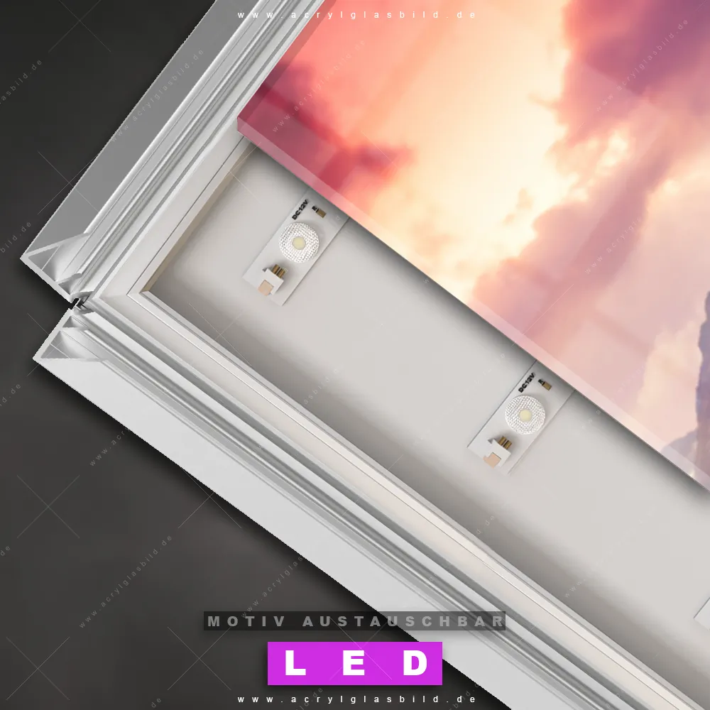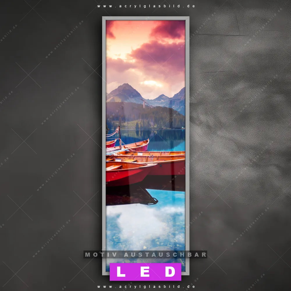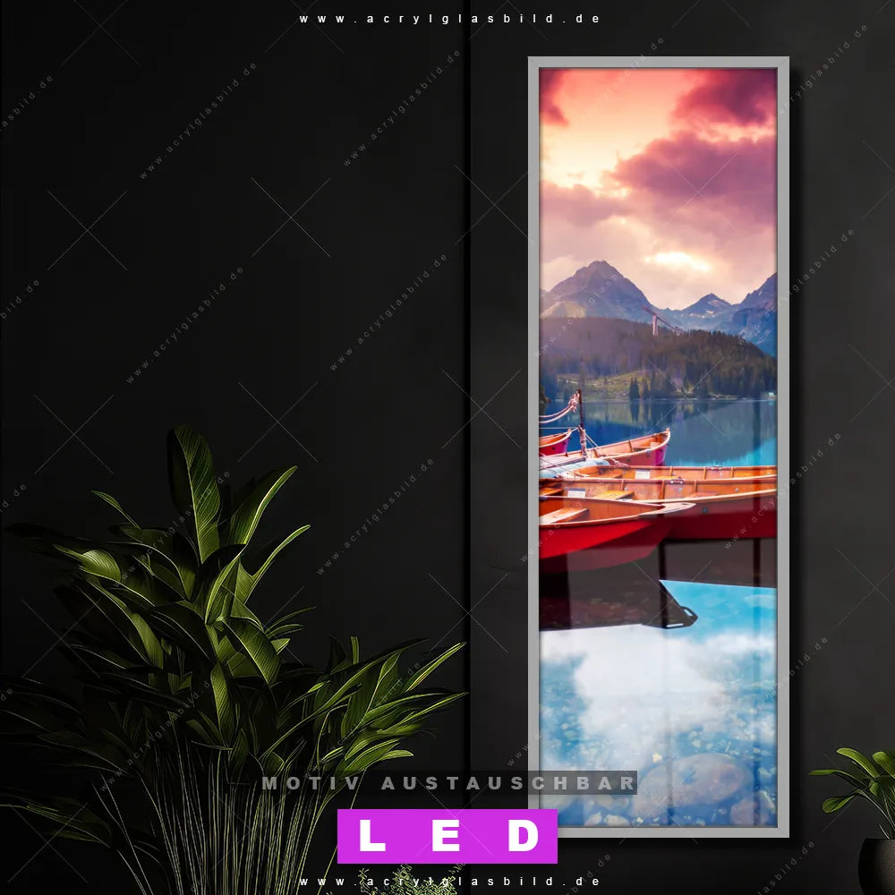 Bist du bereit, deine Wände mit einem dimmbaren LED Bild mit Fernbedienung und optionaler Farbtemperatursteuerung auf das nächste Level zu bringen? Unser Landschaften Canvalight® DIA LED Acrylglasbild ist genau das, was du brauchst! Das Wandbild mit LED Beleuchtung im Schmalen Format mit austauschbarer bedruckter Acrylglas-Scheibe Ruhiger Bergsee bringt Licht und Stil in dein Zuhause – und das in null Komma nichts!
