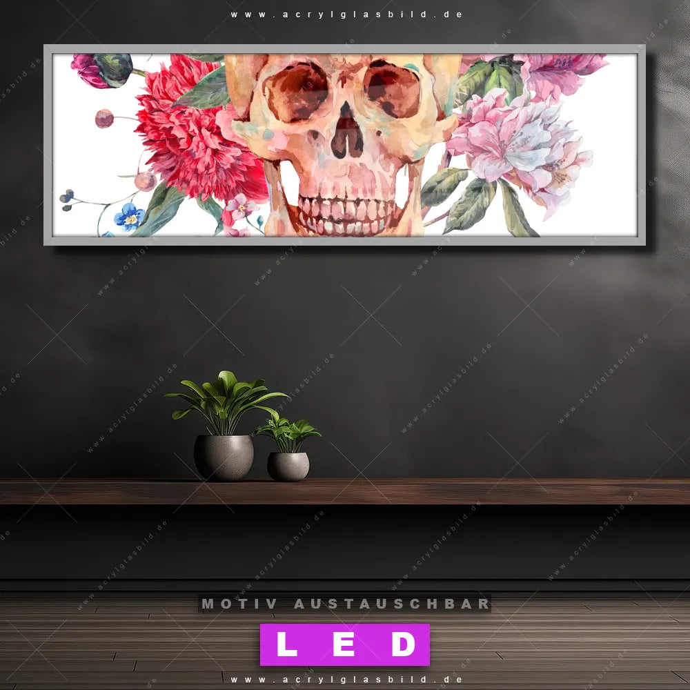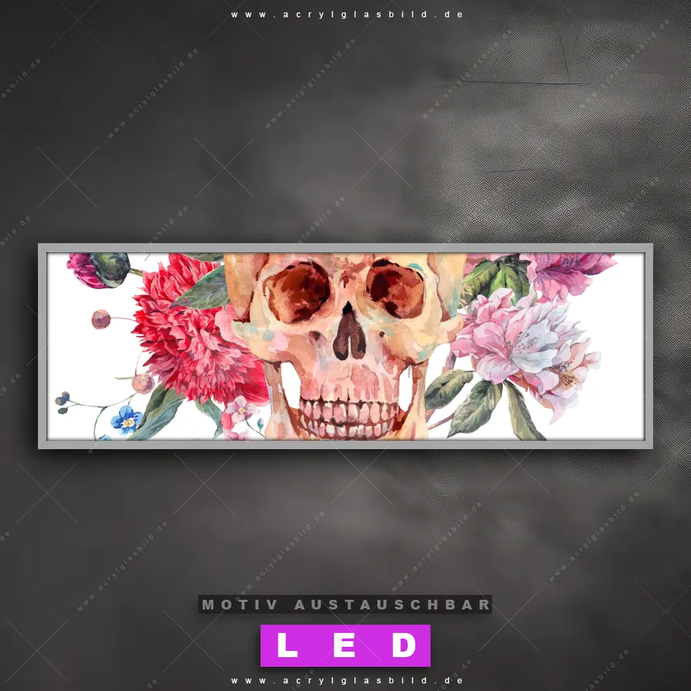 Deine Wände könnten dringend ein dimmbares LED Bild mit Fernbedienung und optionaler Farbtemperatursteuerung gebrauchen? Dann haben wir das perfekte Wandbild mit LED Beleuchtung für dich: unser mega-cooles Blumen - Botanik, Porträts - Menschen Canvalight® DIA LED Acrylglasbild! Mit unserem angesagten Leuchtbild aus Acrylglas im Panorama-Format und der austauschbaren bedruckten Acrylglas-Scheibe Schädel im Boho Stil bringst du nicht nur Licht, sondern auch jede Menge Flair in deine Räume.