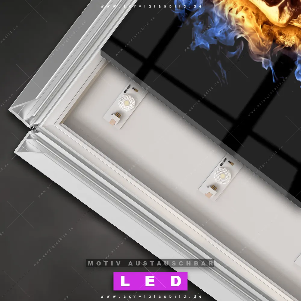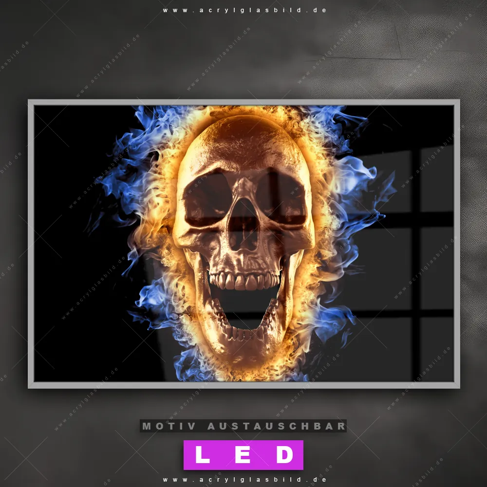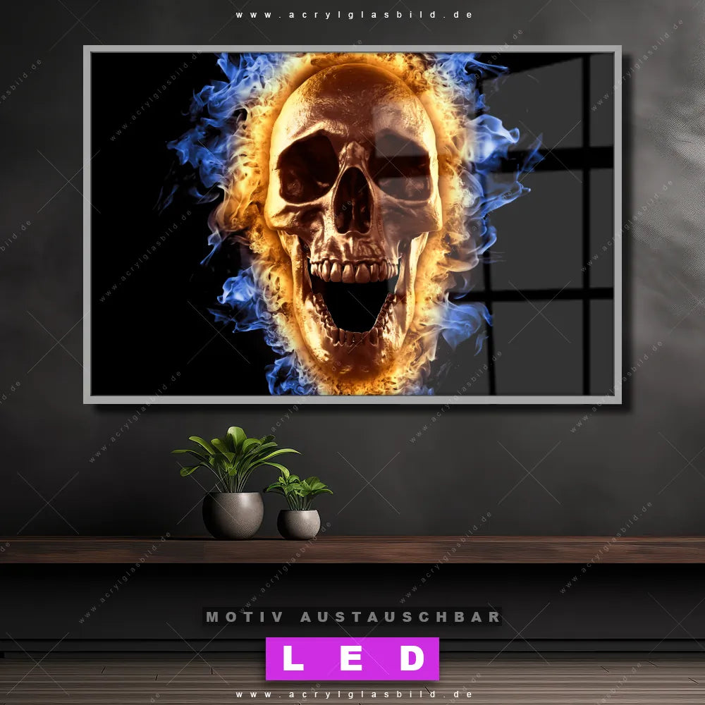 Du bist auf der Suche nach einem dimmbaren Porträts - Menschen LED Bild mit Fernbedienung und optionaler Farbtemperatursteuerung? Dann haben wir hier genau das richtige Wandbild mit LED Beleuchtung für dich: Unser Canvalight® DIA LED Acrylglasbild Schädel in Flammen im Querformat mit austauschbarer bedruckter Acrylglas-Scheibe. Dieses Leuchtbild bringt sofort Partybeleuchtung in deine Räume!