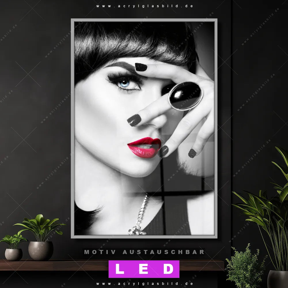 Wer braucht schon langweilige Wände, wenn man sie mit unserem LED Acrylglasbild Canvalight® DIA sinnlicher Blick aufpeppen kann? Dank der genialen LED-Ausleuchtung wirst du in Bar - Gastronomie, Friseur - Beauty, Wohnzimmer - Schlafzimmer nie wieder über deine eigenen Füße stolpern. Wenn du nach einem beleuchteten Wandbild aus Acrylglas mit Frau, Lippen, Mund, Porträt, modern, Beauty, Schönheit, Mädchen suchst, dann ist unser LED Acrylglasbild verführerische Lippen in den hammermäßigen Motiv-Farben Schwarz, Weiss, Rot genau das richtige LED Bild für dich. Im coolen Modern Art, Schwarz - Weiss Stil gestaltet, passt das LED Leuchtbild mit DIA-Klapprahmen und glänzender Front aus Acrylglas perfekt zu jedem Einrichtungsstil – sogar zu deinem chaotischen Kreativlabor!