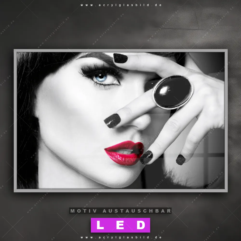 Mit unserem LED Acrylglasbild Canvalight® DIA sinnlicher Blick und seiner genialen LED-Ausleuchtung wirst du nie wieder im Dunkeln auf deinem Sofa herumtappen. Wenn du nach einem beleuchteten Wandbild aus Acrylglas mit Frau, Lippen, Mund, Porträt, modern, Beauty, Schönheit, Mädchen für Bar - Gastronomie, Friseur - Beauty, Wohnzimmer - Schlafzimmer suchst, ist unser LED Leuchtbild verführerische Lippen in den beeindruckenden Motiv-Farben Schwarz, Weiss, Rot genau das richtige beleuchtete Wandbild für dich. Gestaltet im Modern Art, Schwarz - Weiss Stil, passt dieses LED Wandbild mit DIA-Klapprahmen und glänzender Front aus Acrylglas perfekt zu jedem Einrichtungsstil – sogar zu deinem chaotischen kreativen Durcheinander!