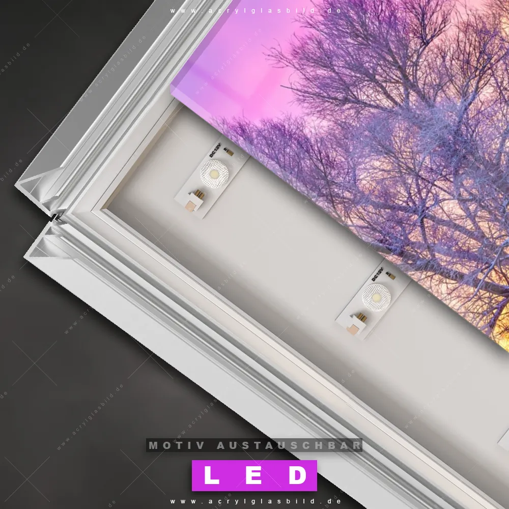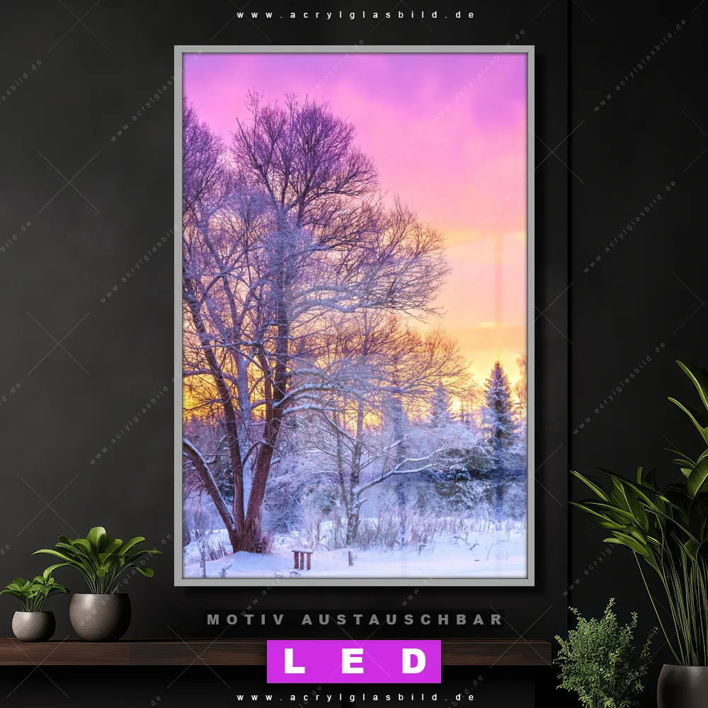 Wer braucht schon langweilige Wände, wenn man sie mit unserem LED Acrylglasbild Canvalight® DIA Sonnenuntergang im Winter aufpeppen kann? Dank der genialen LED-Ausleuchtung wirst du in Arzt - Praxis, Bar - Gastronomie, Büro - Kanzlei, Flur - Eingangsbereich, Wohnzimmer - Schlafzimmer nie wieder über deine eigenen Füße stolpern. Wenn du nach einem beleuchteten Wandbild aus Acrylglas mit Schneelandschaft, Winter, Schnee, Sonnenaufgang, Weihnachten, Wald suchst, dann ist unser LED Acrylglasbild Winterlandschaft mit Schnee in den hammermäßigen Motiv-Farben Weiss, Orange, Lila, Pink genau das richtige LED Bild für dich. Im coolen Natürlich - Realistisch Stil gestaltet, passt das LED Leuchtbild mit DIA-Klapprahmen und glänzender Front aus Acrylglas perfekt zu jedem Einrichtungsstil – sogar zu deinem chaotischen Kreativlabor!