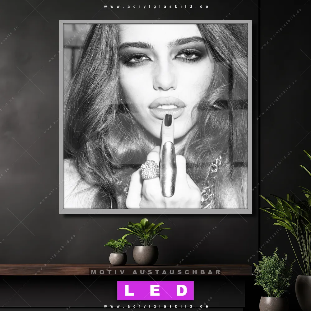 Vergiss dunkle Ecken und Langeweile! Mit unserem Acrylglasbild Frau zeigt Mittelfinger und seiner brillanten LED-Ausleuchtung wirst du dich nie wieder in der Dunkelheit verirren. Wenn du auf der Suche nach einem beleuchteten Wandbild aus Acrylglas mit Frau, Lippen, Mund, Porträt, modern, Beauty, Schönheit, Mädchen, Finger, Mittelfinger, Stinkefinger bist, ist unser LED Acrylglasbild Canvalight® DIA selbstbewusste Frau mit den strahlenden Motiv-Farben Schwarz, Weiss genau das richtige Leuchtbild für dich. Das im Modern Art, Schwarz - Weiss Stil gestaltete LED Bild mit glänzender Front aus Acrylglas passt perfekt zu jedem Einrichtungsstil in Bar - Gastronomie, Friseur - Beauty, Wohnzimmer - Schlafzimmer – vom minimalistischen Chic bis zum kreativen Chaos.