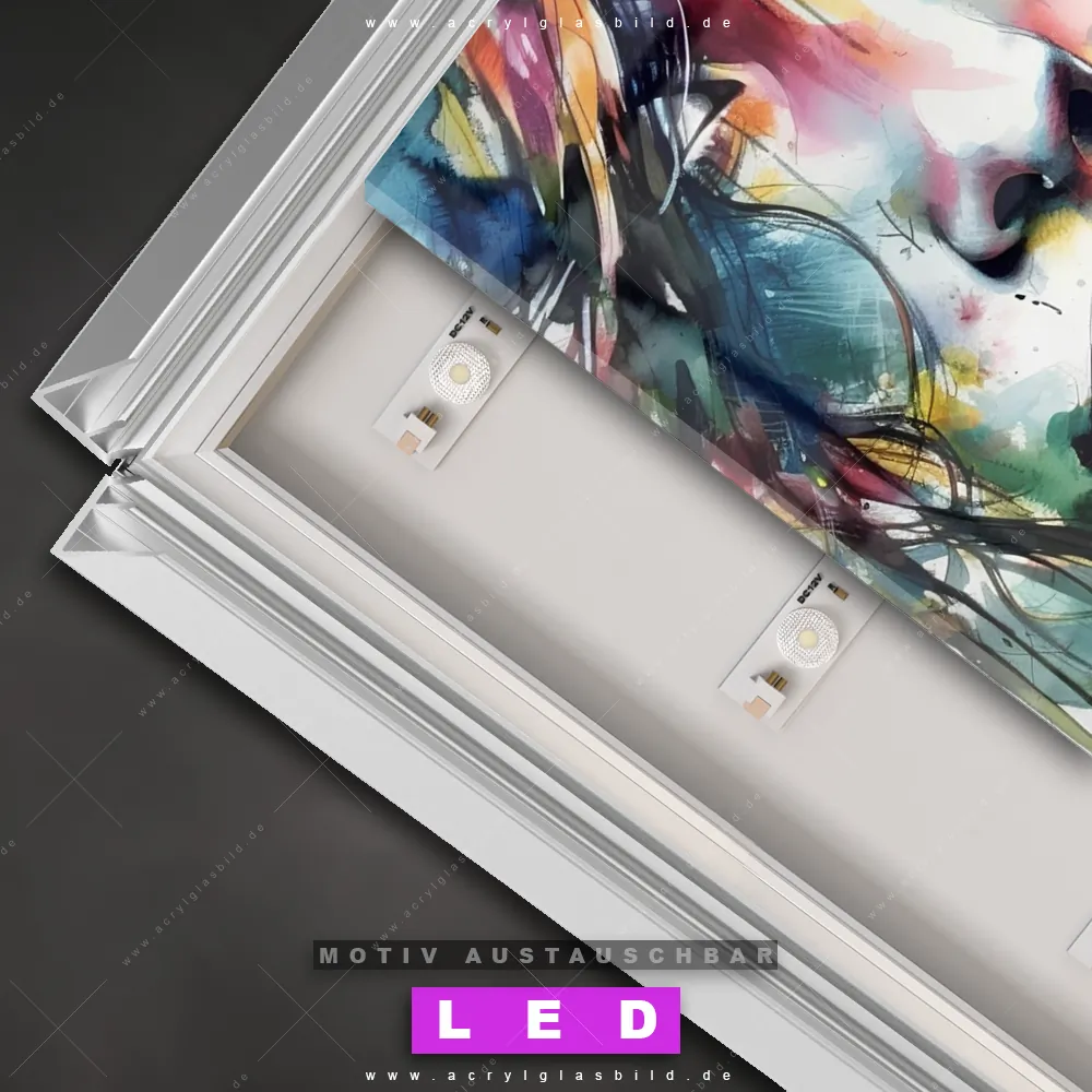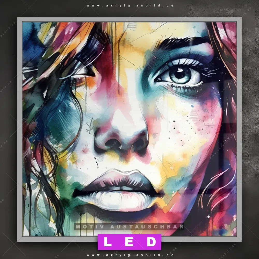 Vergiss dunkle Ecken und Langeweile! Mit unserem Acrylglasbild Abstrakte Schönheit in bunten Farben und seiner brillanten LED-Ausleuchtung wirst du dich nie wieder in der Dunkelheit verirren. Wenn du auf der Suche nach einem beleuchteten Wandbild aus Acrylglas mit Frau, Portrait, Gesicht, Mädchen, Dame, Schönheit, Farbe bist, ist unser LED Acrylglasbild Canvalight® DIA Gesicht einer Frau - Aquarell mit den strahlenden Motiv-Farben Bunt genau das richtige Leuchtbild für dich. Das im Abstrakt, Modern Art Stil gestaltete LED Bild mit glänzender Front aus Acrylglas passt perfekt zu jedem Einrichtungsstil in Wohnzimmer - Schlafzimmer, Bar - Gastronomie, Friseur - Beauty, Arzt - Praxis, Flur - Eingangsbereich – vom minimalistischen Chic bis zum kreativen Chaos.