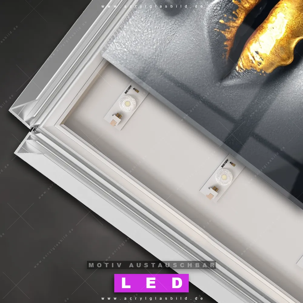 Also, worauf wartest du noch? Gib mit einem beleuchteten Wandbild mit wechselbarer Acrylglas-Scheibe deinen Wänden das gewisse Etwas und bestelle jetzt das LED Acrylglasbild Canvalight® DIA Attraktivität in metallischen Farben – dein Zuhause wird es dir danken und deine Freunde werden dank der wechselbaren Motive erblassen!