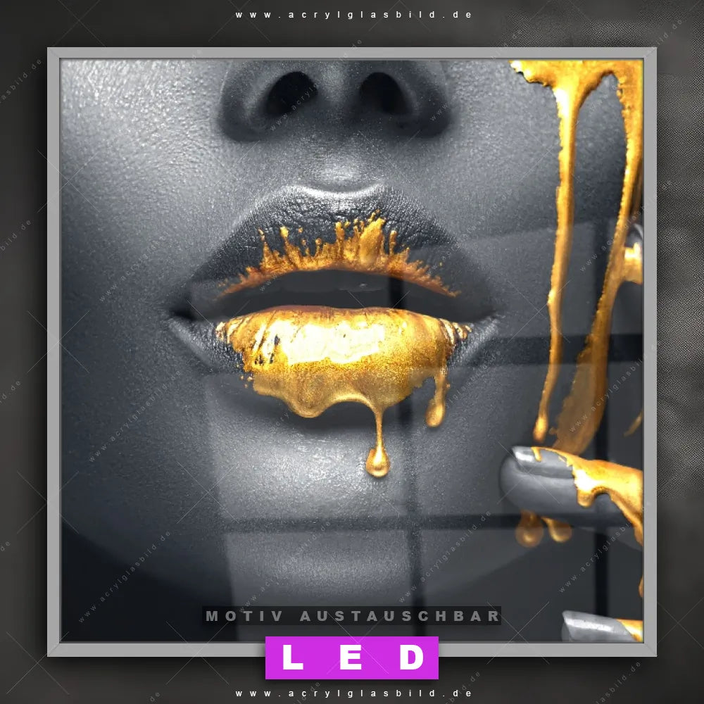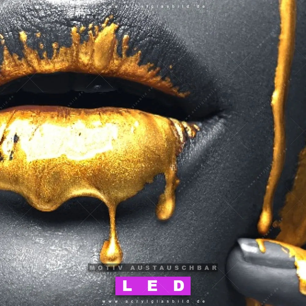Vergiss dunkle Ecken und Langeweile! Mit unserem Acrylglasbild Gesicht einer Frau in Silber & Gold und seiner brillanten LED-Ausleuchtung wirst du dich nie wieder in der Dunkelheit verirren. Wenn du auf der Suche nach einem beleuchteten Wandbild aus Acrylglas mit Frau, Lippen, Mund, Porträt, Erotik, modern, Gold, Silber, Farbe, Beauty bist, ist unser LED Acrylglasbild Canvalight® DIA Goldener Farbfluss über silbernes Gesicht mit den strahlenden Motiv-Farben Gold, Silber, Schwarz genau das richtige Leuchtbild für dich. Das im Modern Art Stil gestaltete LED Bild mit glänzender Front aus Acrylglas passt perfekt zu jedem Einrichtungsstil in Friseur - Beauty, Wohnzimmer - Schlafzimmer, Flur - Eingangsbereich, Büro - Kanzlei, Bar - Gastronomie – vom minimalistischen Chic bis zum kreativen Chaos.