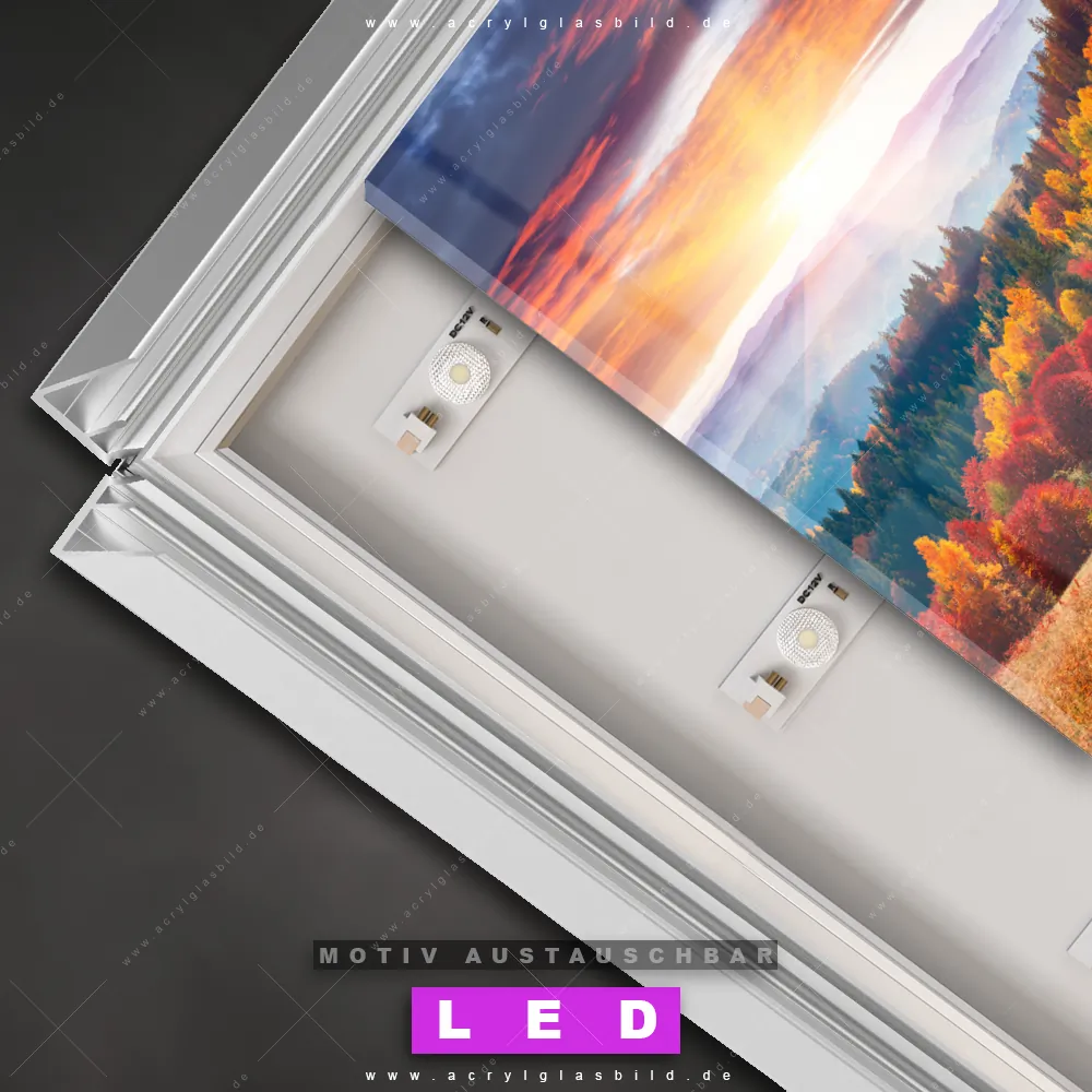 Also, worauf wartest du noch? Gib mit einem beleuchteten Wandbild mit wechselbarer Acrylglas-Scheibe deinen Wänden das gewisse Etwas und bestelle jetzt das LED Acrylglasbild Canvalight® DIA Herbstwald mit farbenprächtigem Himmel – dein Zuhause wird es dir danken und deine Freunde werden dank der wechselbaren Motive erblassen!