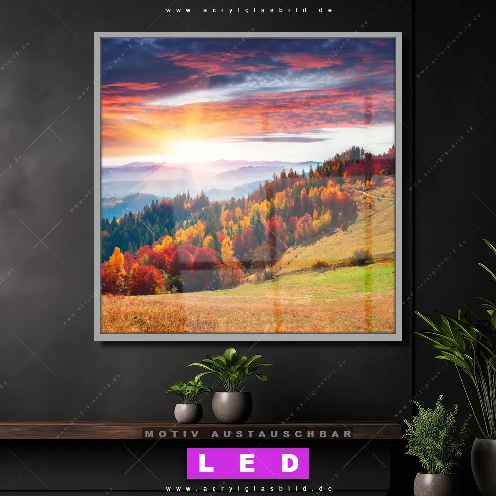 Vergiss dunkle Ecken und Langeweile! Mit unserem Acrylglasbild Sonnenuntergang im Herbst und seiner brillanten LED-Ausleuchtung wirst du dich nie wieder in der Dunkelheit verirren. Wenn du auf der Suche nach einem beleuchteten Wandbild aus Acrylglas mit Wald, Landschaft, Bäume, Natur, Baum, Buche, Ruhe, Stille bist, ist unser LED Acrylglasbild Canvalight® DIA farbenfrohe Landschaft mit den strahlenden Motiv-Farben Braun, Orange, Lila, Grün genau das richtige Leuchtbild für dich. Das im Natürlich - Realistisch Stil gestaltete LED Bild mit glänzender Front aus Acrylglas passt perfekt zu jedem Einrichtungsstil in Wohnzimmer - Schlafzimmer, Flur - Eingangsbereich, Büro - Kanzlei, Arzt - Praxis – vom minimalistischen Chic bis zum kreativen Chaos.