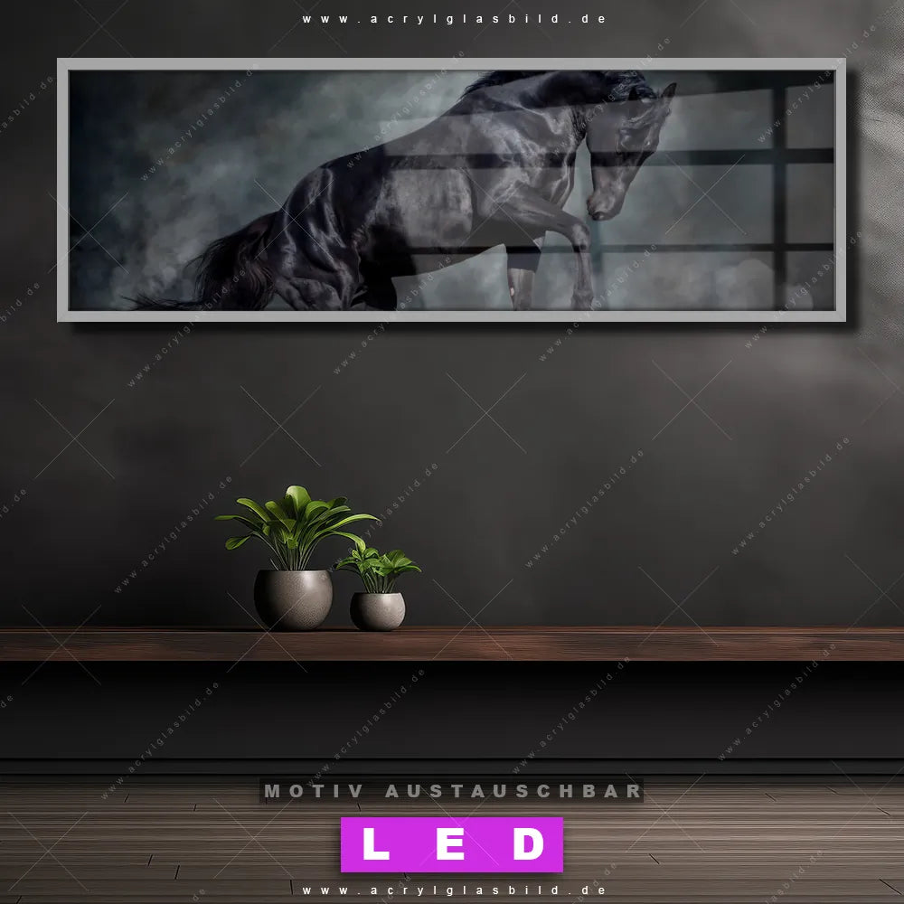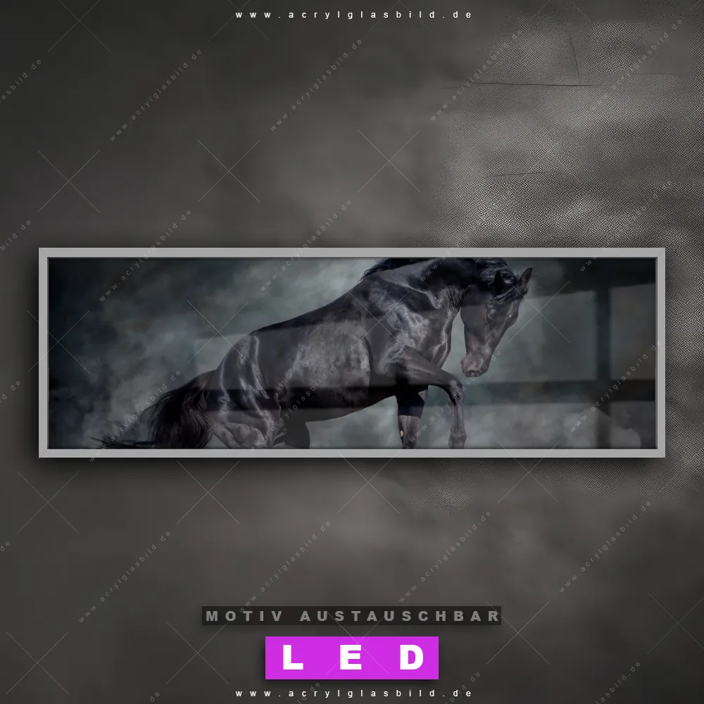 Deine Wände könnten dringend ein dimmbares LED Bild mit Fernbedienung und optionaler Farbtemperatursteuerung gebrauchen? Dann haben wir das perfekte Wandbild mit LED Beleuchtung für dich: unser mega-cooles Tierwelt Canvalight® DIA LED Acrylglasbild! Mit unserem angesagten Leuchtbild aus Acrylglas im Panorama-Format und der austauschbaren bedruckten Acrylglas-Scheibe Schwarzer Hengst bringst du nicht nur Licht, sondern auch jede Menge Flair in deine Räume.