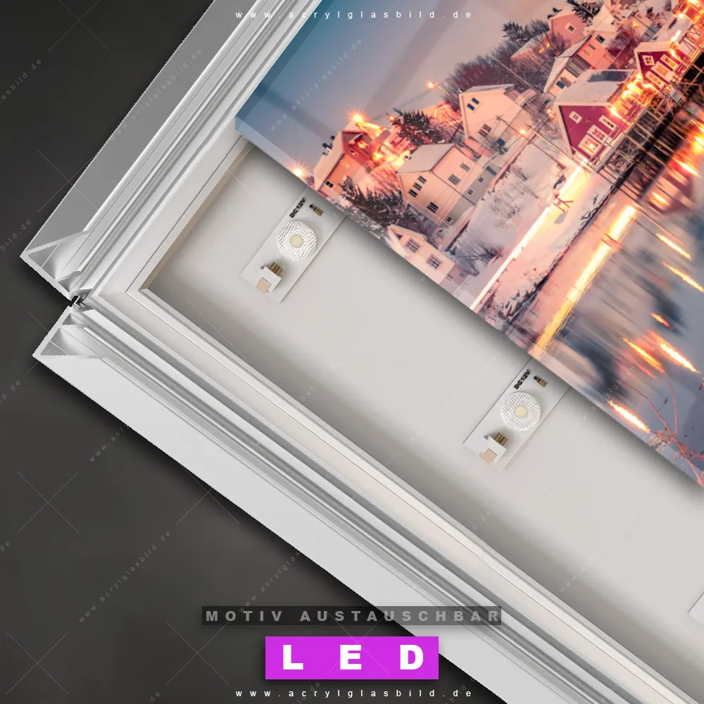 LED Acrylglasbild Canvalight® DIA | Skandinavische Stadt bei Nacht | Hochformat