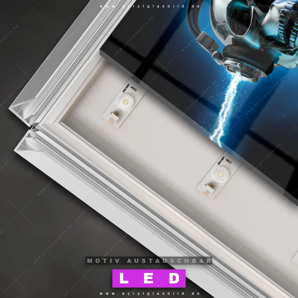 Also, worauf wartest du noch? Gib mit einem beleuchteten Wandbild mit wechselbarer Acrylglas-Scheibe deinen Wänden das gewisse Etwas und bestelle jetzt das LED Acrylglasbild Canvalight® DIA Totenkopf hört Musik – dein Zuhause wird es dir danken und deine Freunde werden dank der wechselbaren Motive erblassen!