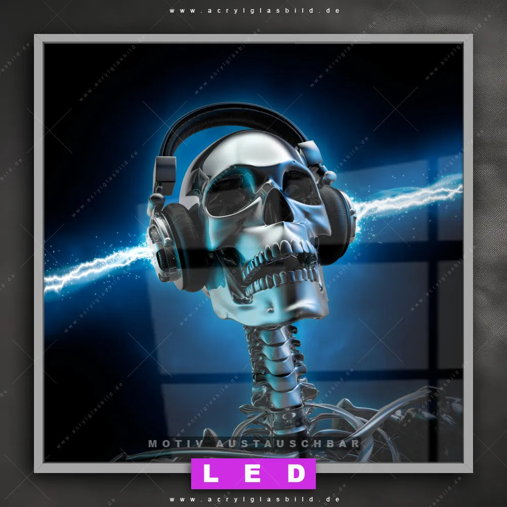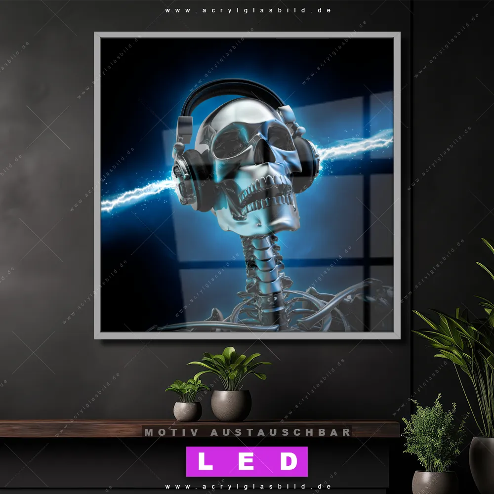 Vergiss dunkle Ecken und Langeweile! Mit unserem Acrylglasbild Beat in den Ohren und seiner brillanten LED-Ausleuchtung wirst du dich nie wieder in der Dunkelheit verirren. Wenn du auf der Suche nach einem beleuchteten Wandbild aus Acrylglas mit Schädel, Totenkopf, Skelett, Kopfhörer, Musik, Sound bist, ist unser LED Acrylglasbild Canvalight® DIA Totenkopf mit Kopfhörern mit den strahlenden Motiv-Farben Schwarz, Blau genau das richtige Leuchtbild für dich. Das im Surreal - Fantasy, Modern Art Stil gestaltete LED Bild mit glänzender Front aus Acrylglas passt perfekt zu jedem Einrichtungsstil in Wohnzimmer - Schlafzimmer, Flur - Eingangsbereich, Büro - Kanzlei – vom minimalistischen Chic bis zum kreativen Chaos.