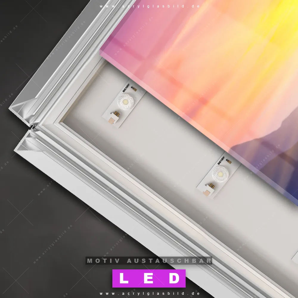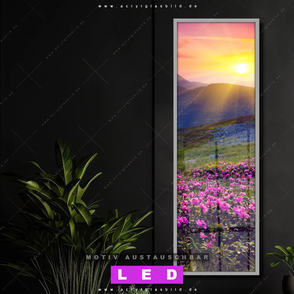 Bist du bereit, deine Wände mit einem dimmbaren LED Bild mit Fernbedienung und optionaler Farbtemperatursteuerung auf das nächste Level zu bringen? Unser Landschaften Canvalight® DIA LED Acrylglasbild ist genau das, was du brauchst! Das Wandbild mit LED Beleuchtung im Schmalen Format mit austauschbarer bedruckter Acrylglas-Scheibe Sommerberg im Sonnenuntergang bringt Licht und Stil in dein Zuhause – und das in null Komma nichts!