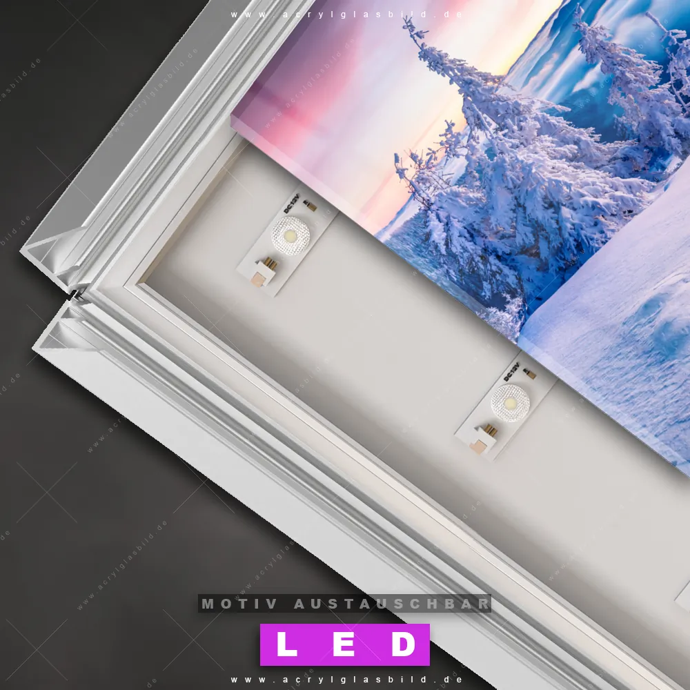 Also, worauf wartest du noch? Gib mit einem beleuchteten Wandbild mit wechselbarer Acrylglas-Scheibe deinen Wänden das gewisse Etwas und bestelle jetzt das LED Acrylglasbild Canvalight® DIA Schnee in den Bergen – dein Zuhause wird es dir danken und deine Freunde werden dank der wechselbaren Motive erblassen!